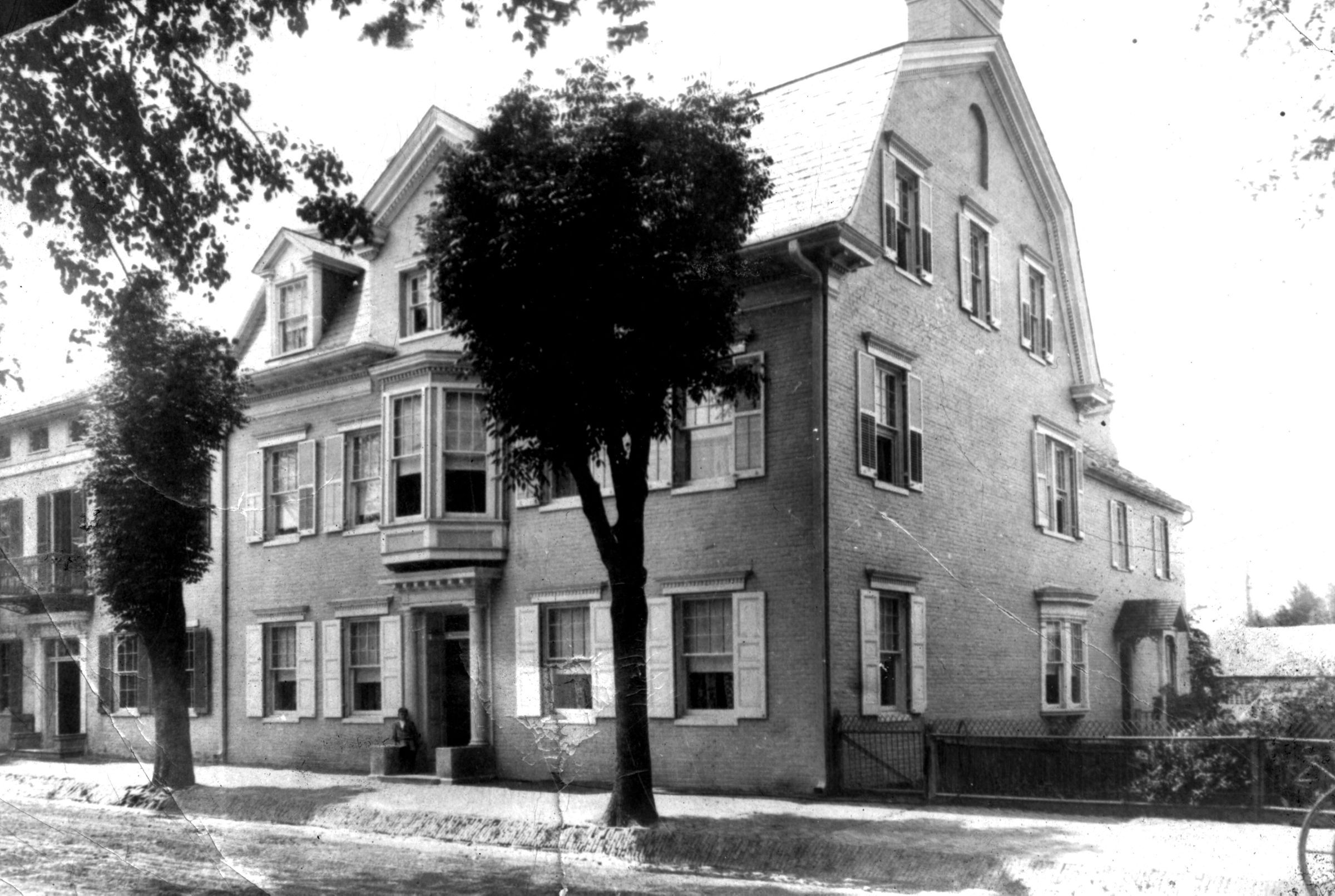 Print, photographic. B/W photograph of Cockey's Tavern (Boyle House; Hoffman's Inn) at 216 East Main Street, Westminster. Shows 3-story brick structure with gambrel roof. An unidentified boy is sitting on the marble front step. A fence runs along the sidewalk to the west (toward 210 E. Main). The roof of a carriage house is visible in the rear. 3.5" x 4.375". C. 1905.Acquisition