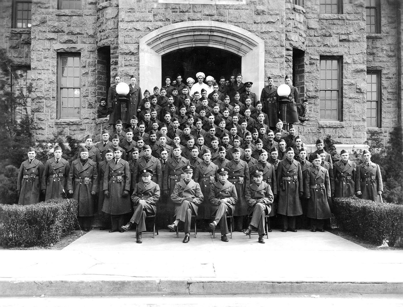 Print, photographic. B/W photo of Company H, Maryland National Guard, 29th Division, in front of the armory in Westminster. Marked "Westminster Studio, Wesminster, MD. Written on back: "Co. H leaving for overseas World War II, Feb. 1941."Acquisition