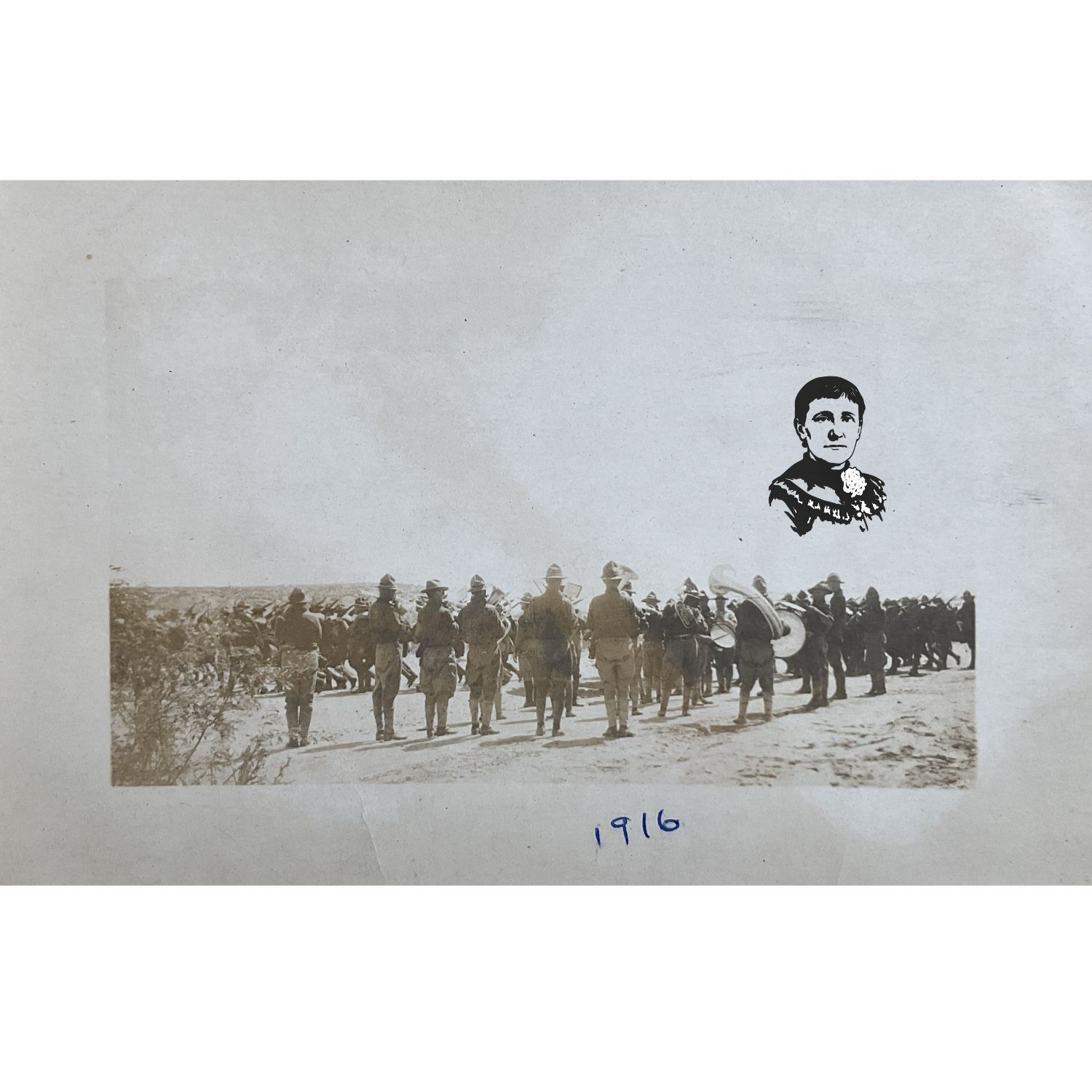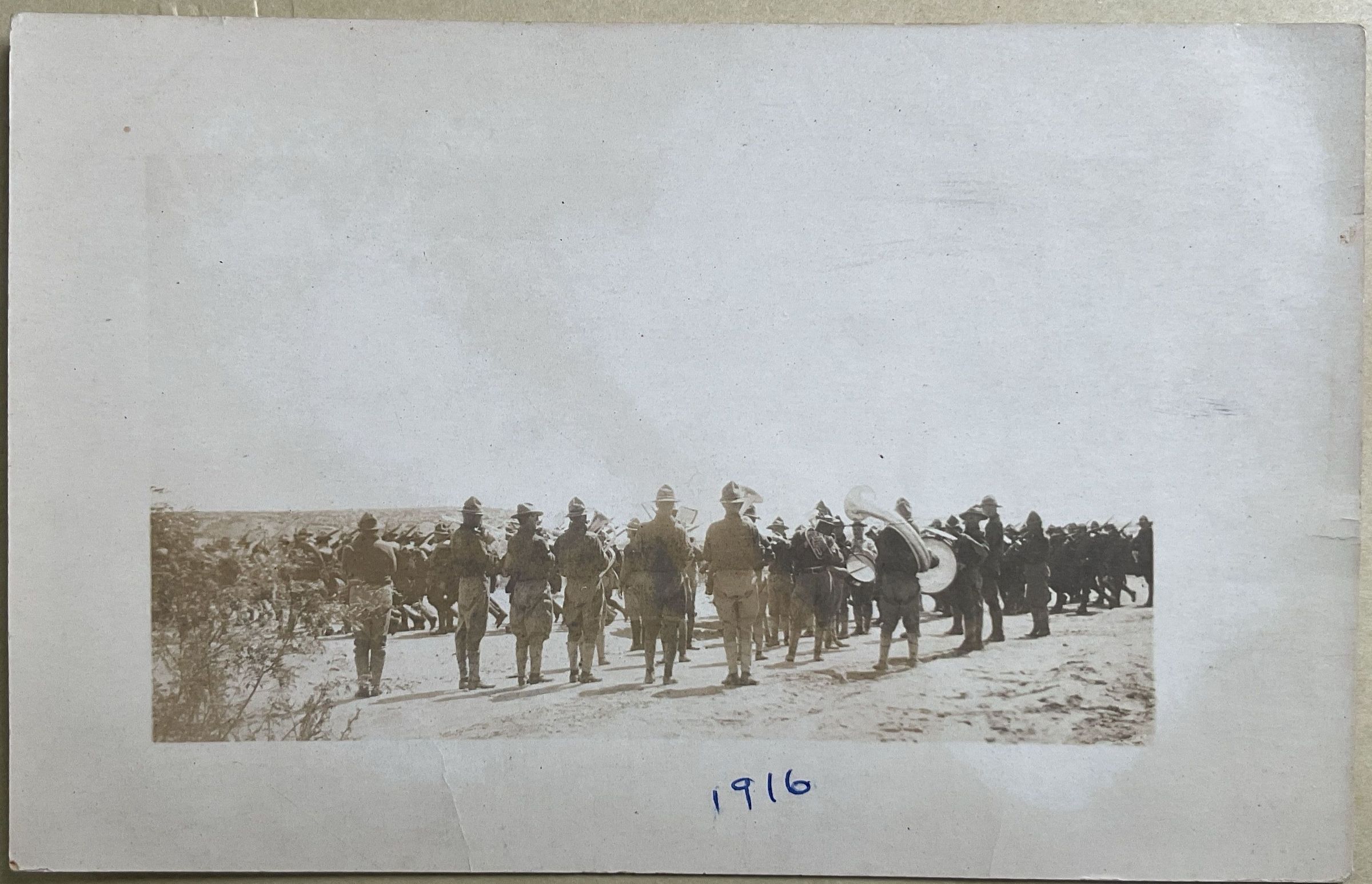 Postcard. B/W image of soldiers in camp at Eagle Pass, Texas. Addressed to Mary B. Shellman; postmarked 21 August 1916 at Eagle Pass. Message reads: "Dear Miss Mary, (?) going to (?) you. This (?) us playing 5th Md.will camp. All are well and (?). Love, Harry."Context