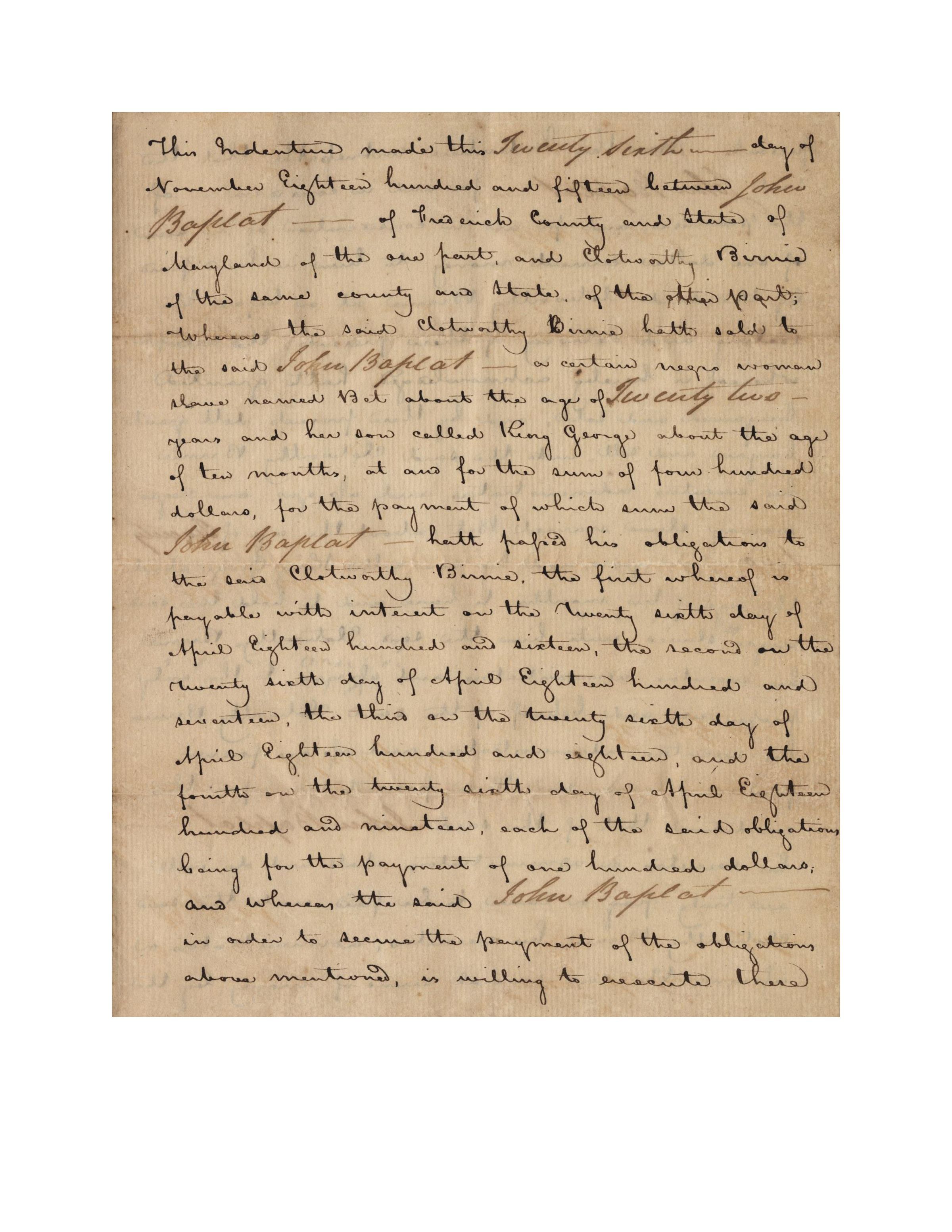 Contract. Sale of slave (Bet) and her son (King George), bought from Clotworthy Birnie by John Baplat, Nov. 26, 1815. Handwritten, 9"x 7.5".General Notes
