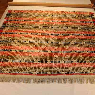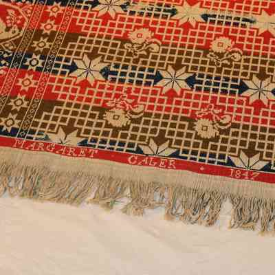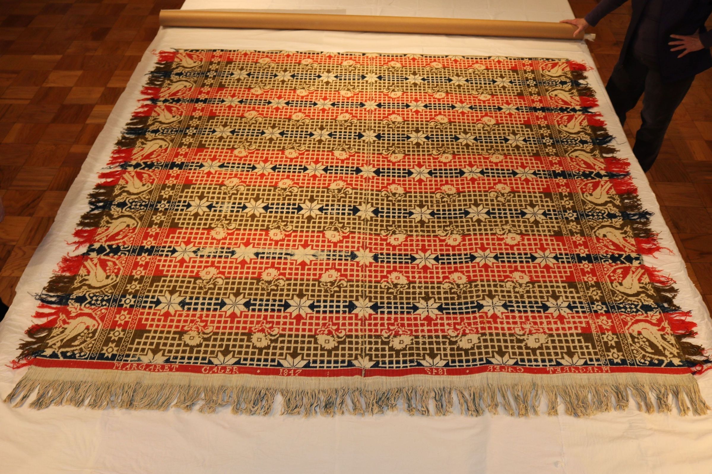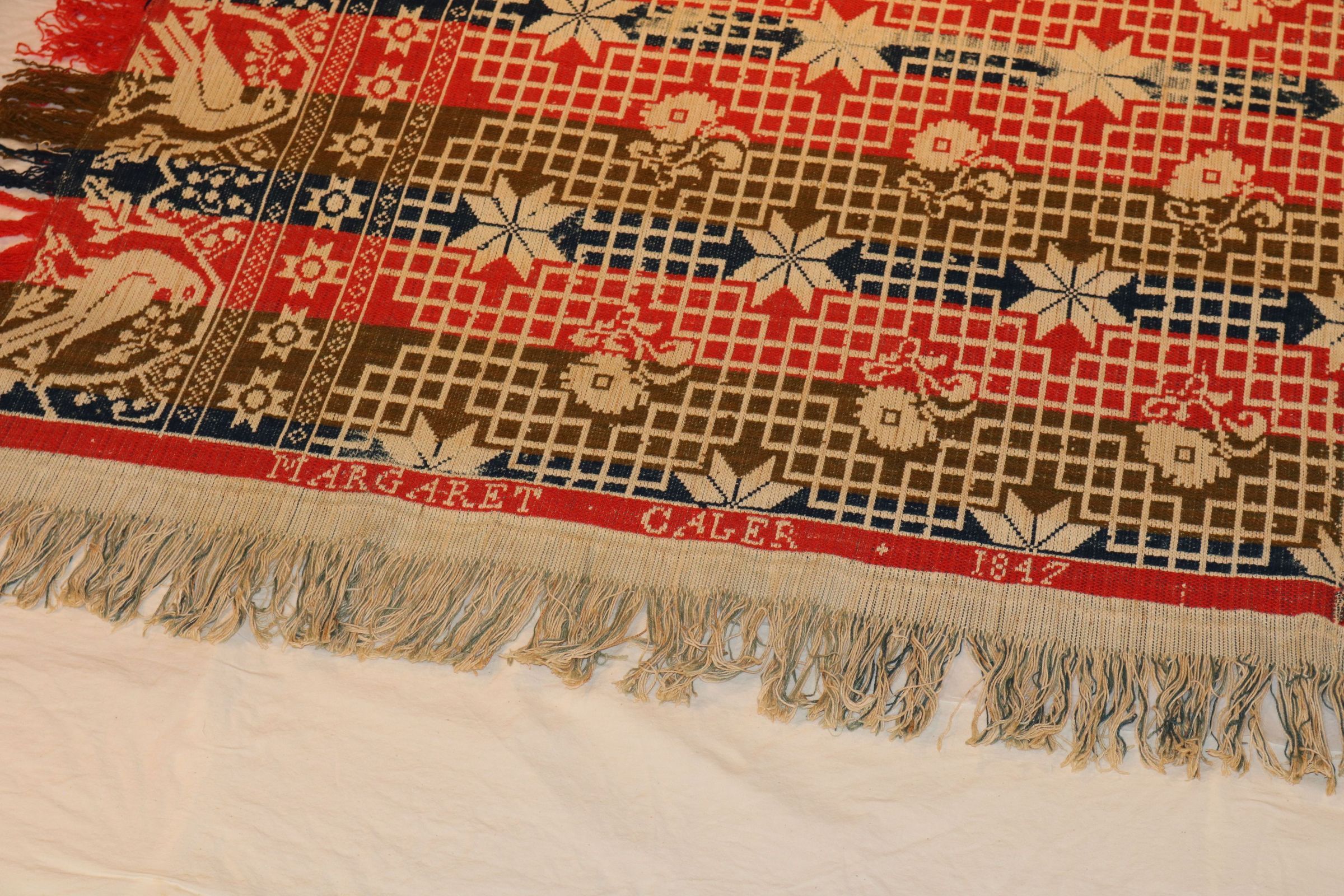 Donor is Margaret Cayler's (Caler) granddaughter. Original deed of gift reads "C-1143-2 Coverlet dated 1847 for Mrs. Margaret Caylor (Caler)". AF tag on roll reads: coverlet, woven, damask; red, blue, brown/green, wool; cream, blue, brown cotton. Made for Margaret Caler, 1847. C:1143:2 Several coverlets were accessioned twice by creating a duplicate deed of gift in the late 1970s. This may be one .