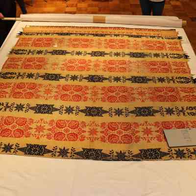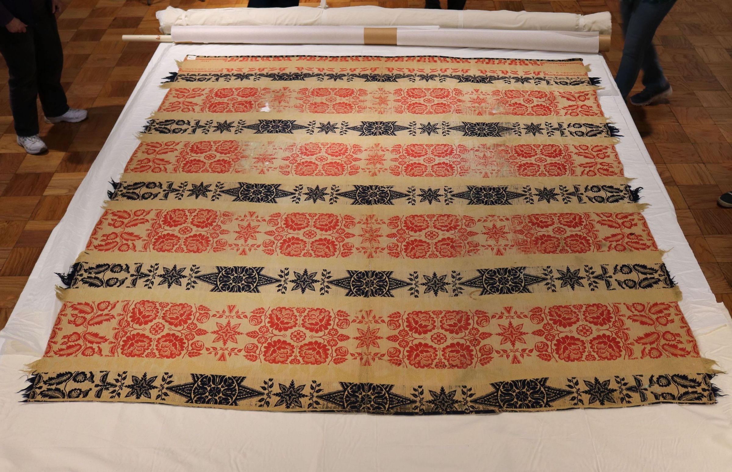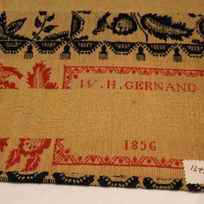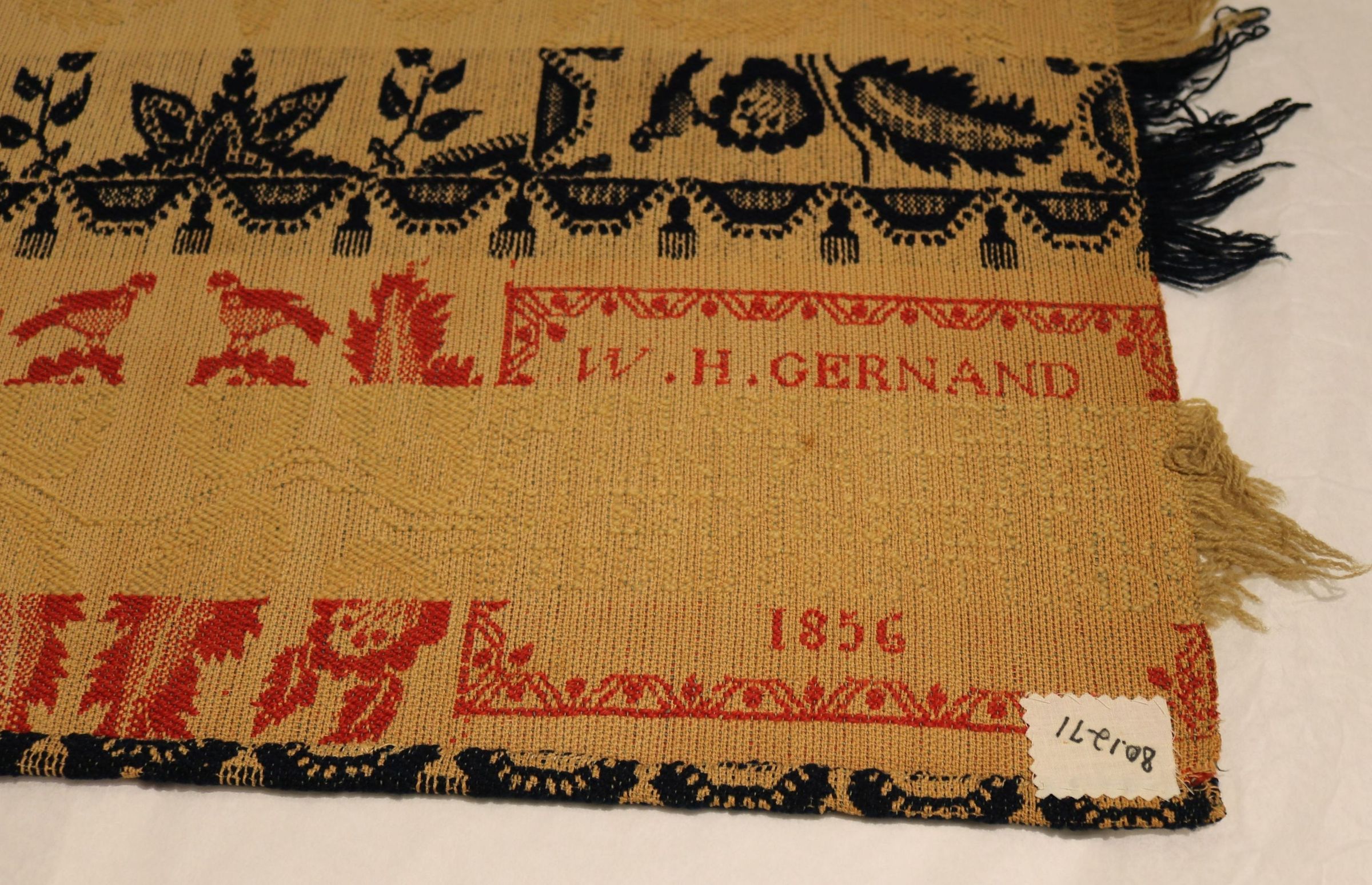 Coverlet. William H. Gernand. Jacquard. Two pieces, seamed down center. In red, beige and blue. Belonged to Henry C. Bennett. 1856Context