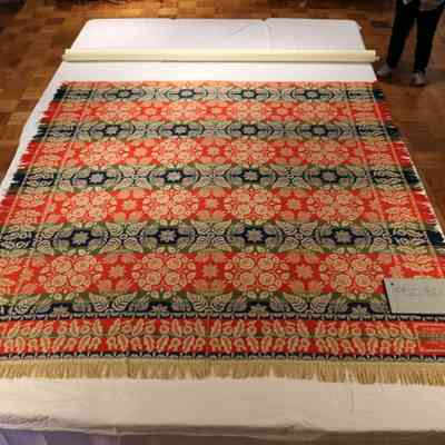 Coverlet. Andrew Kump. Jacquard; warp of natural and blue cotton; weft of natural cotton with green, navy and red wool. Two pieces, seamed down center. Double rose and leaf design on field; bird, flower and leaf border. 1847.
