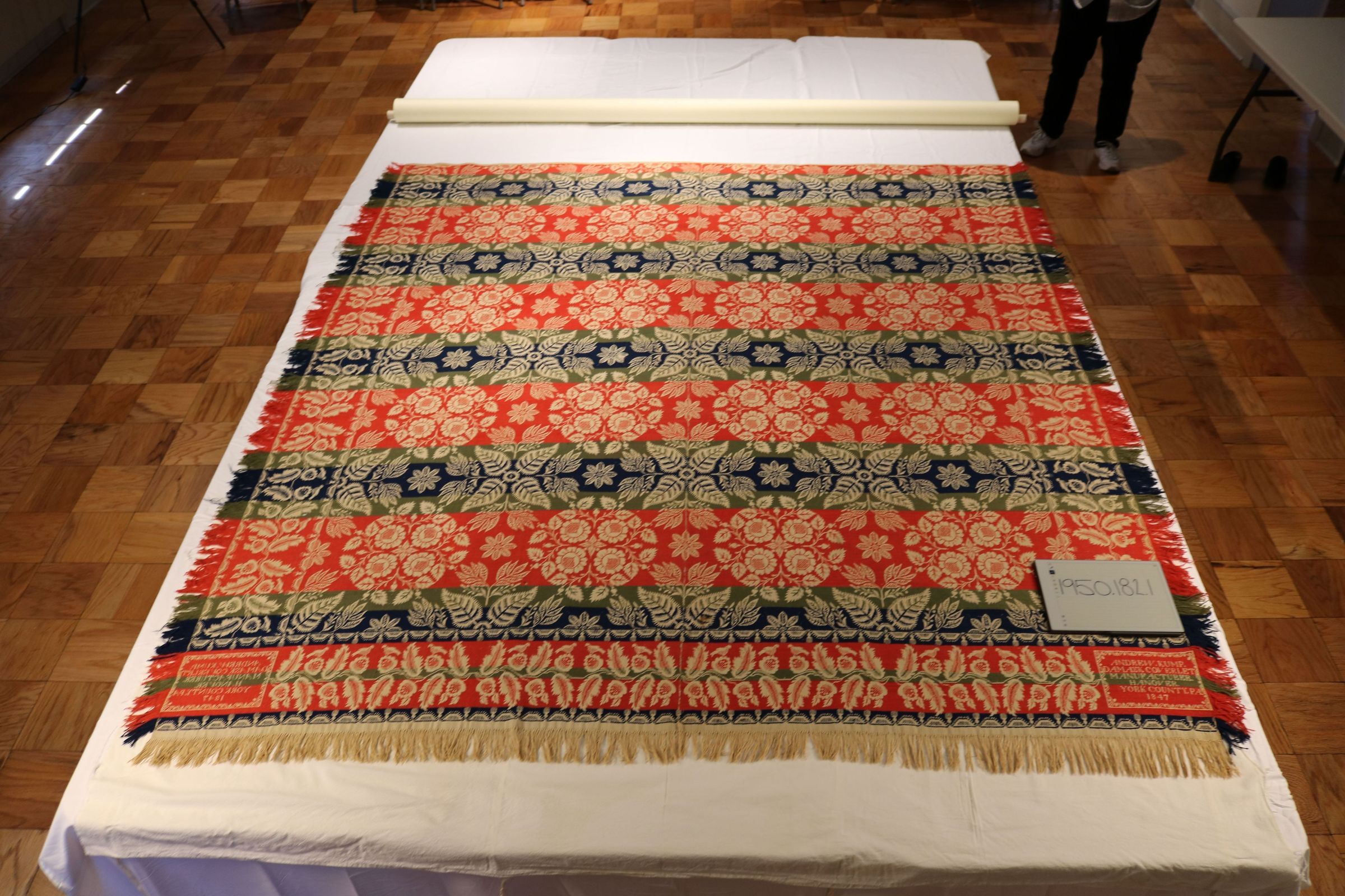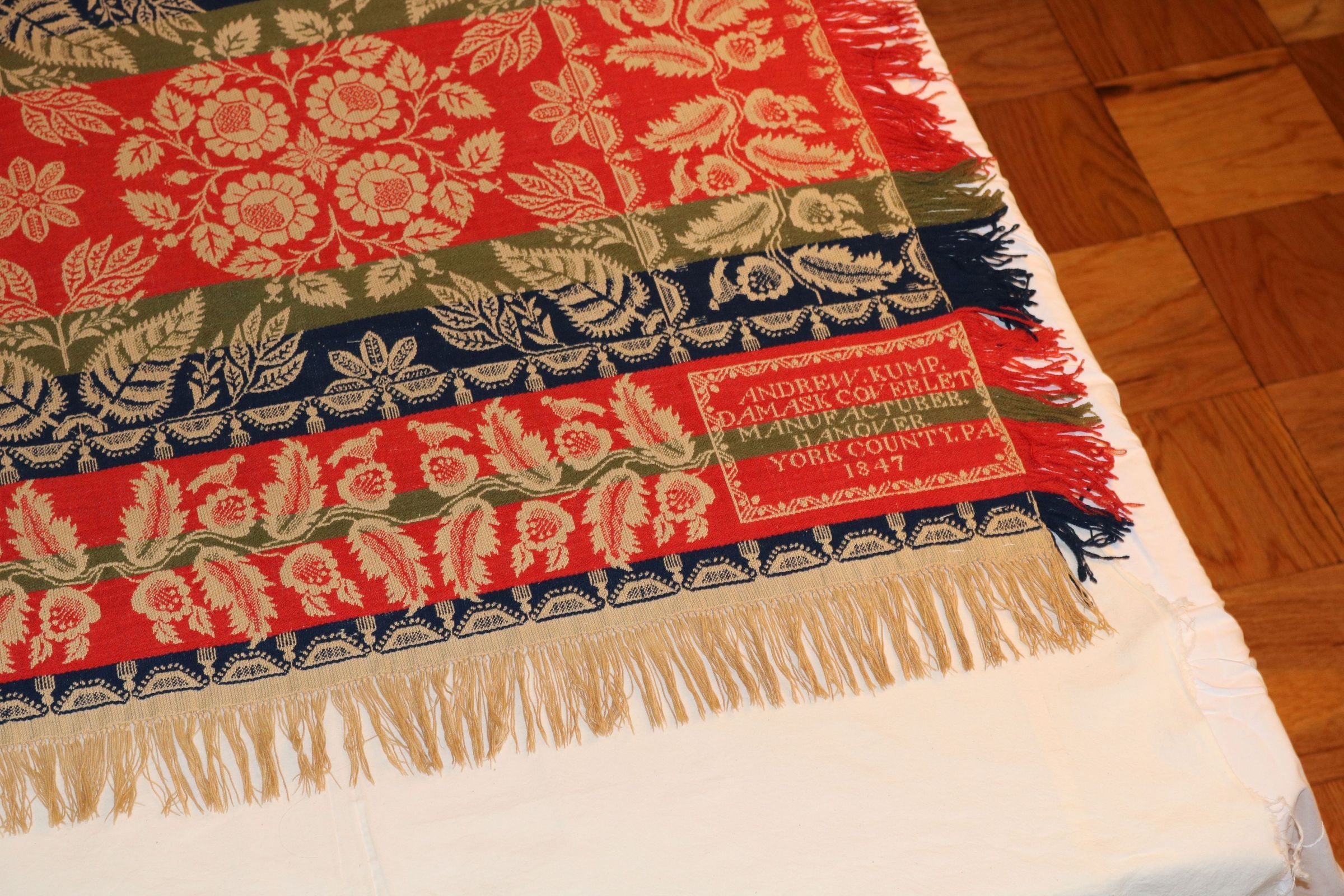 Original deed of gift reads "Coverlet with Andrew Kump damask coverlet, manufacturer, Hanover, York Co, Pa. 1847:" AF tag on roll reads: red, white, blue, and cream coverlet. Kump.
