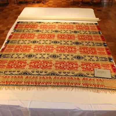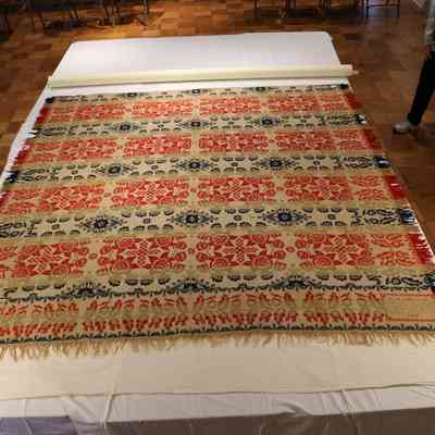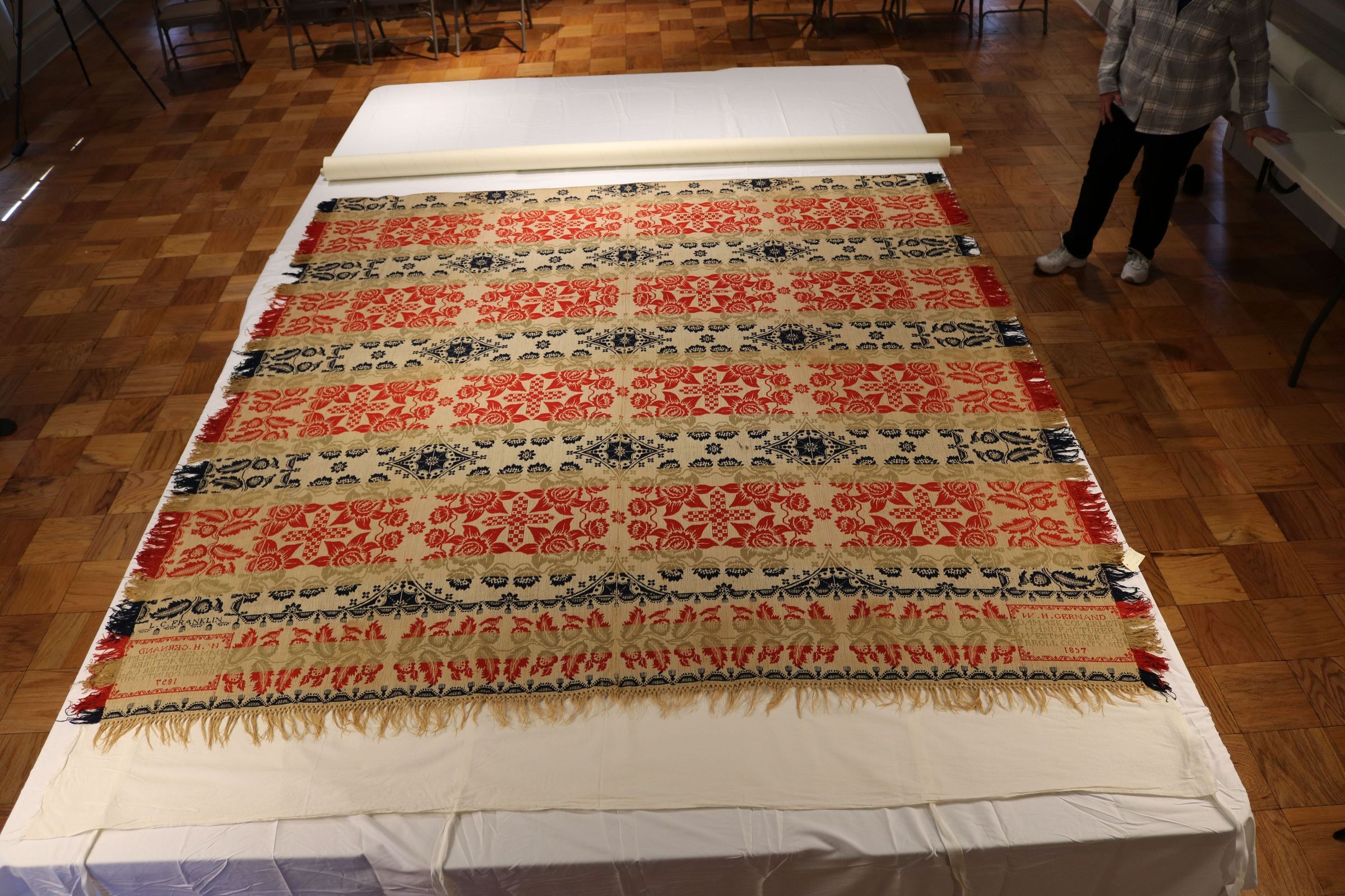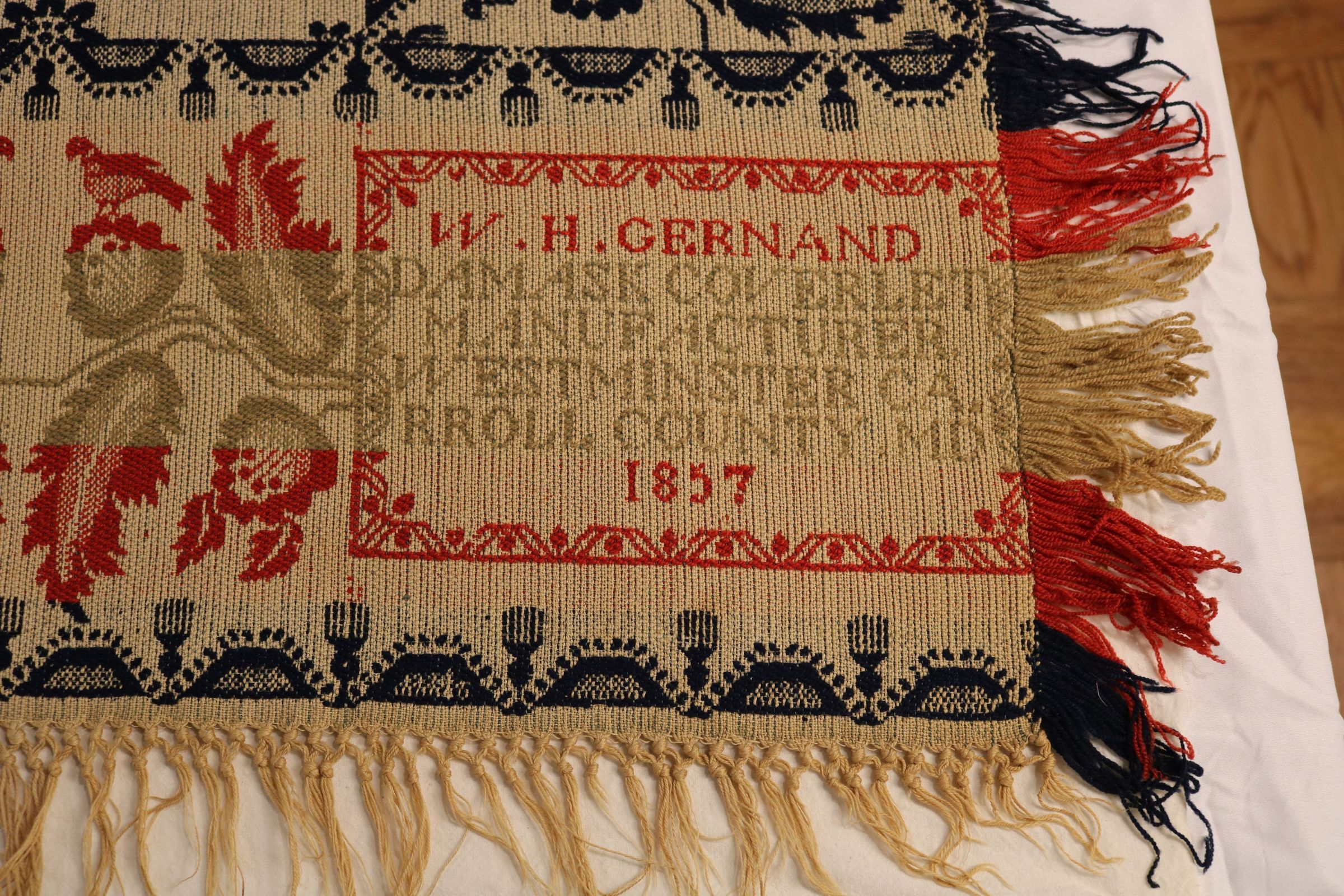Coverlet. William H. Gernand. Jacquard; warp of natural and blue cotton; warp of green red and navy wool. Two pieces, seamed down center. Body has rows of 4 floral medallion with cross at center; wide border with vine and leaves. Maker's block in corner "W.H. GERNAND DAMASK COVERLET"; inscription "L.C. FRANKLIN." 1857.Acquisition