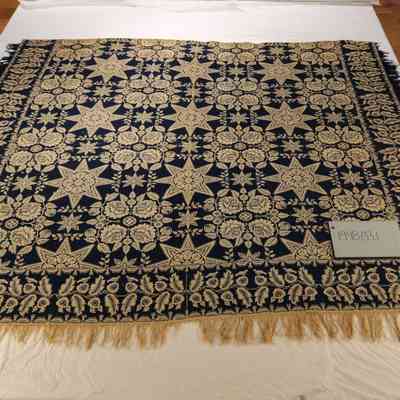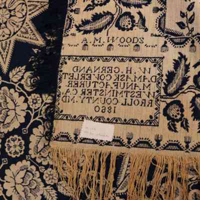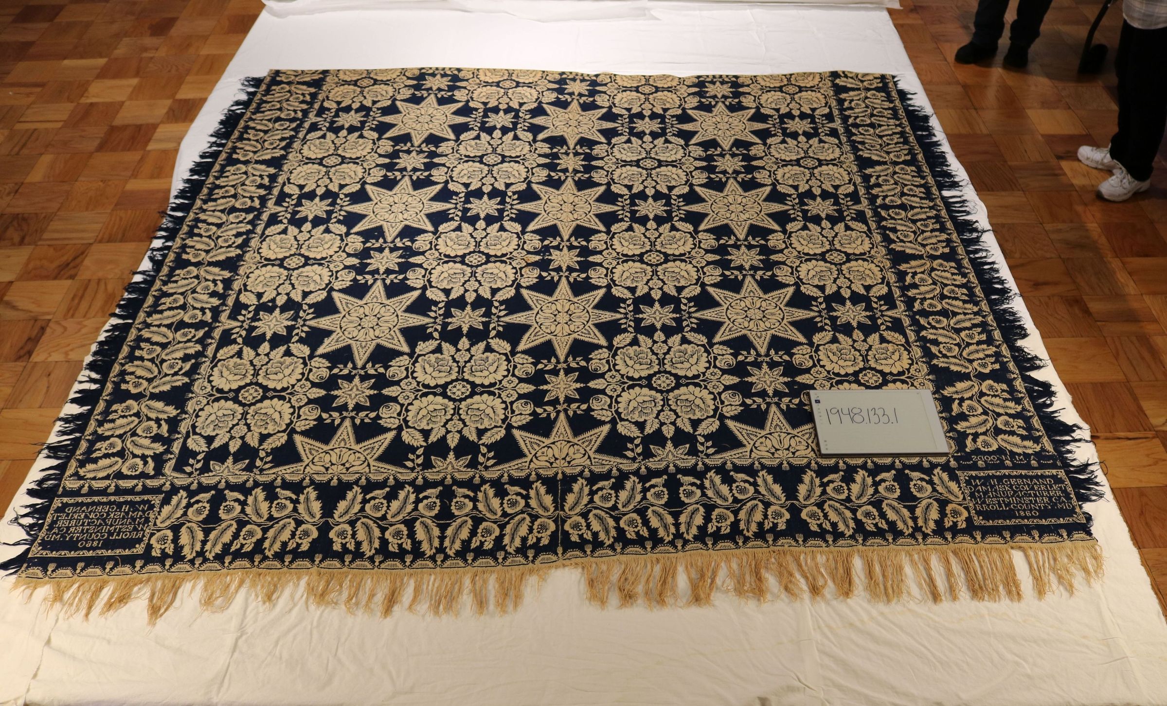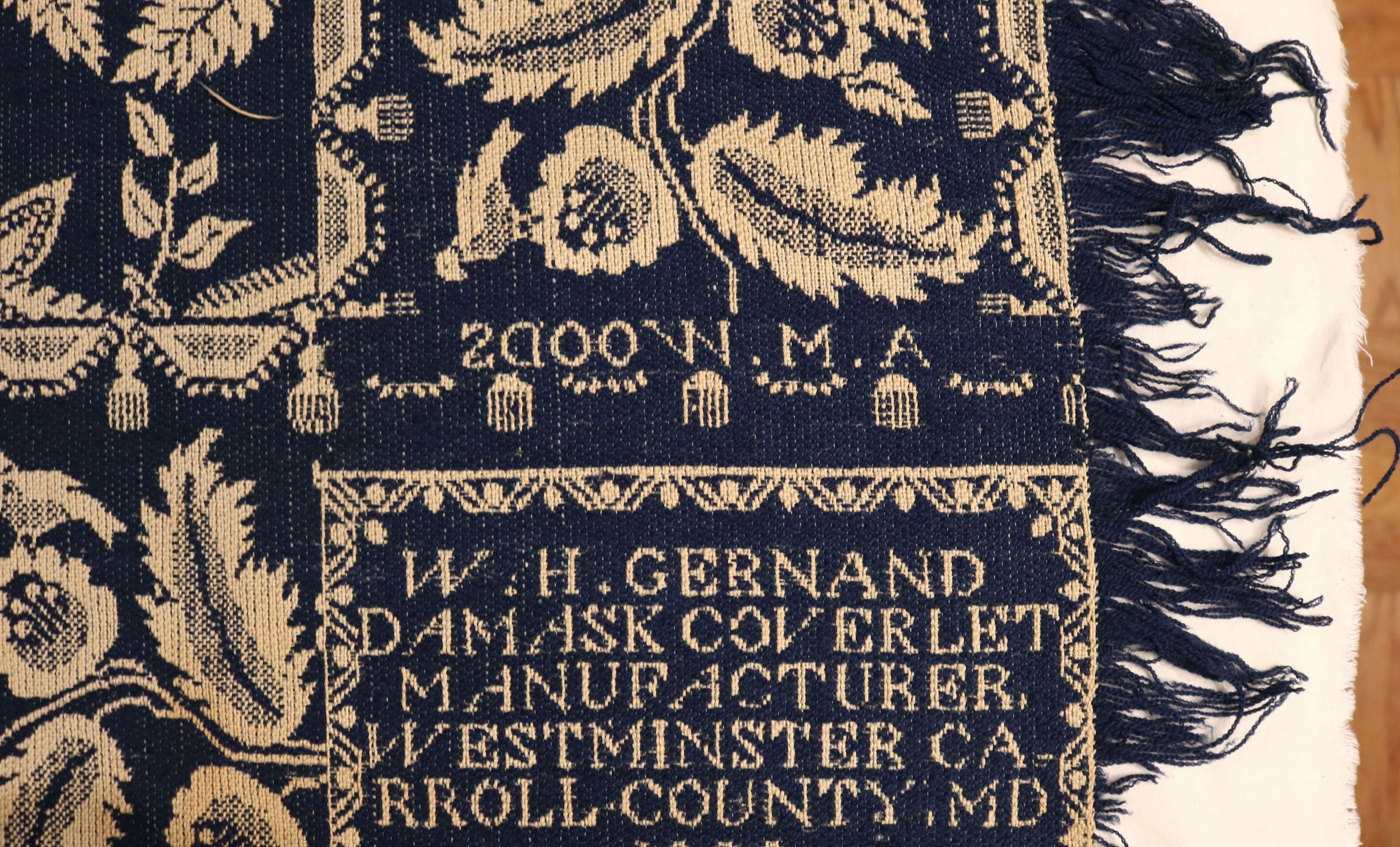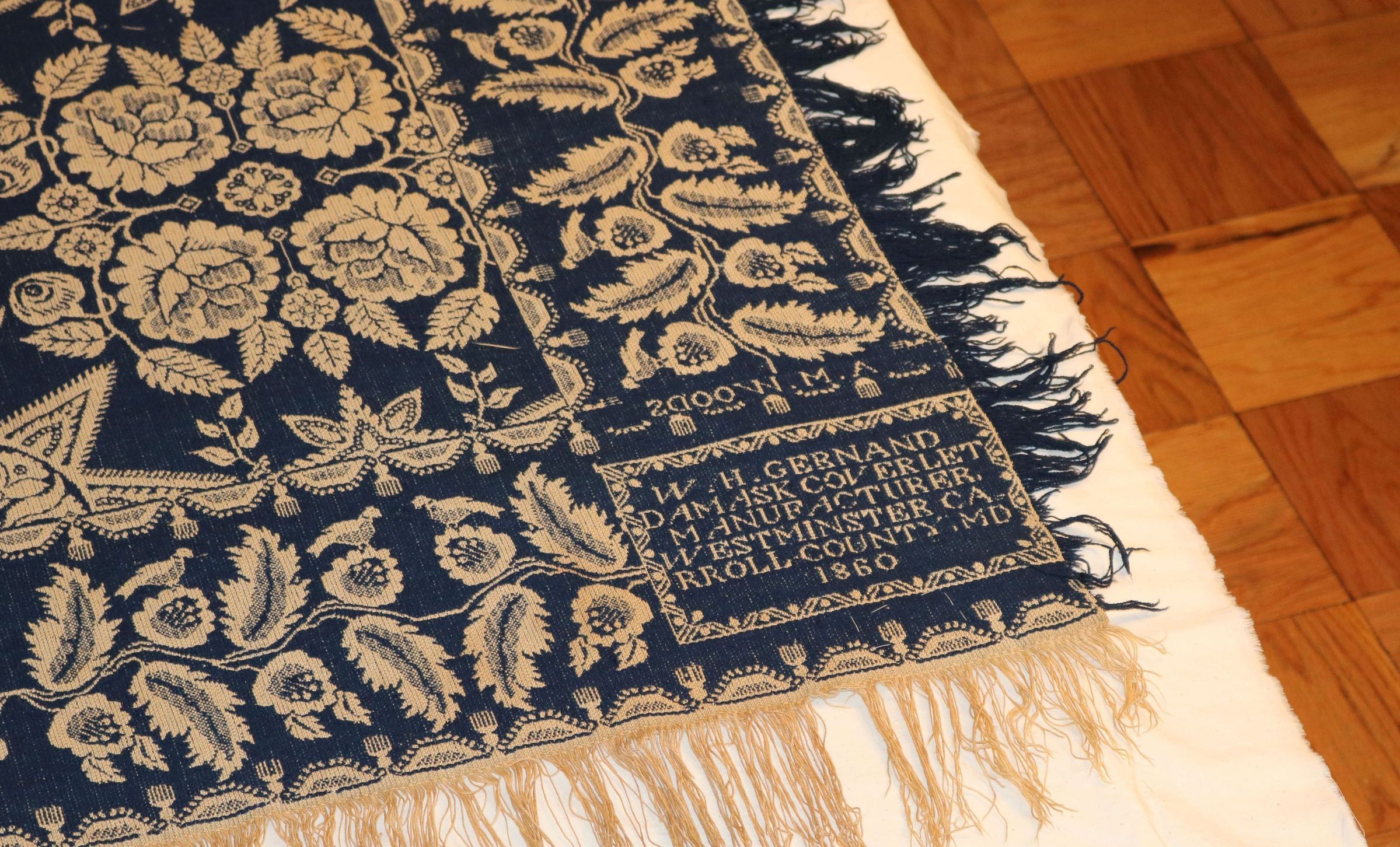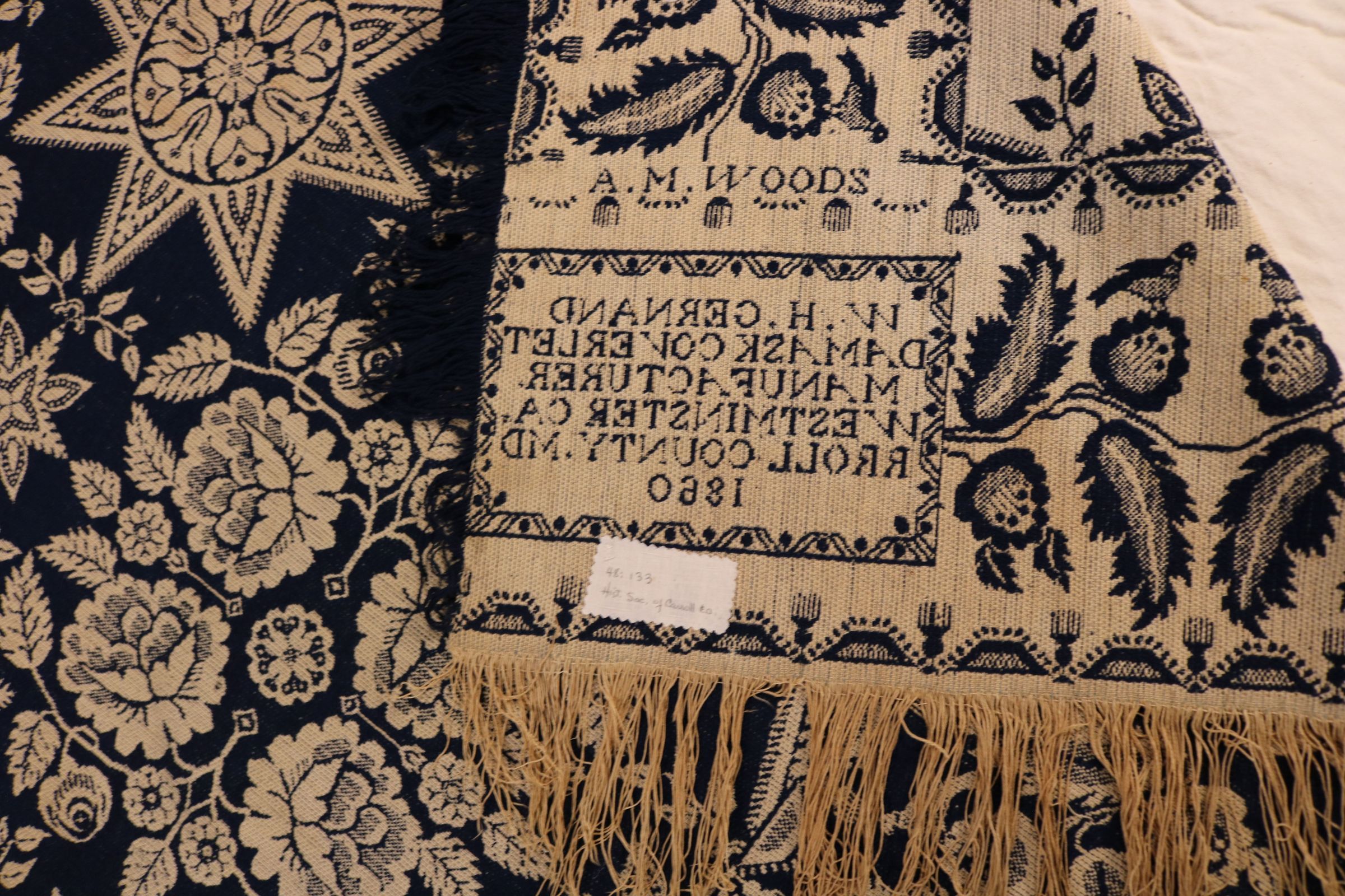 HSCC Newsletter, November 1, 1959 reads "A soft blue and white flowered design made for A. M. Woods 1860, and given to the Society by Mrs. Nance MacDonald MacKay of Baltimore." Original deed of gift reads "coverlet - Gernand 1860". HSCC Newsletter Vol. 8, No. 4, November 1, 1959.