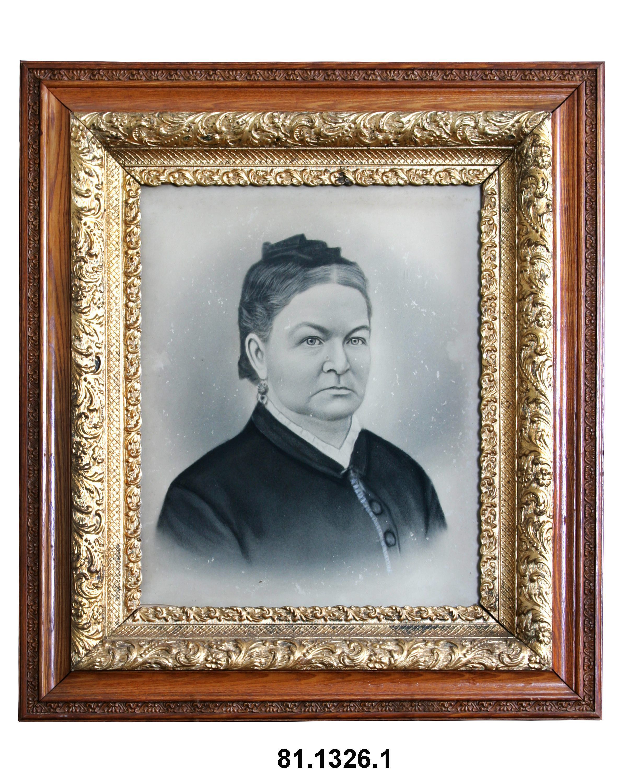 Drawing. Pencil/charcoal on paper. Portrait of woman (Mrs. F. Jesse Crawford), high-button collar, small hat (?), dangly earring. Rectangular, natural wood, gold-painted gesso frame. 30.5"h x 26"w x 3"d.Acquisition