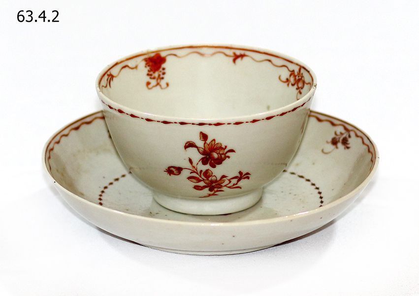 Cup & saucer. Porcelain, Chinese export. C. 1790-1820. (A) Cup: Deep bowl, no handle, short footring. White body with delicate red floral and ribbon design. 2"h x 3.5"w x 3.5"d. (B) Saucer: Deep curved sides, short footring. Central red floral design, ribbon and floral border. 1.125"h x 5.5"w x 5.5"d.Acquisition