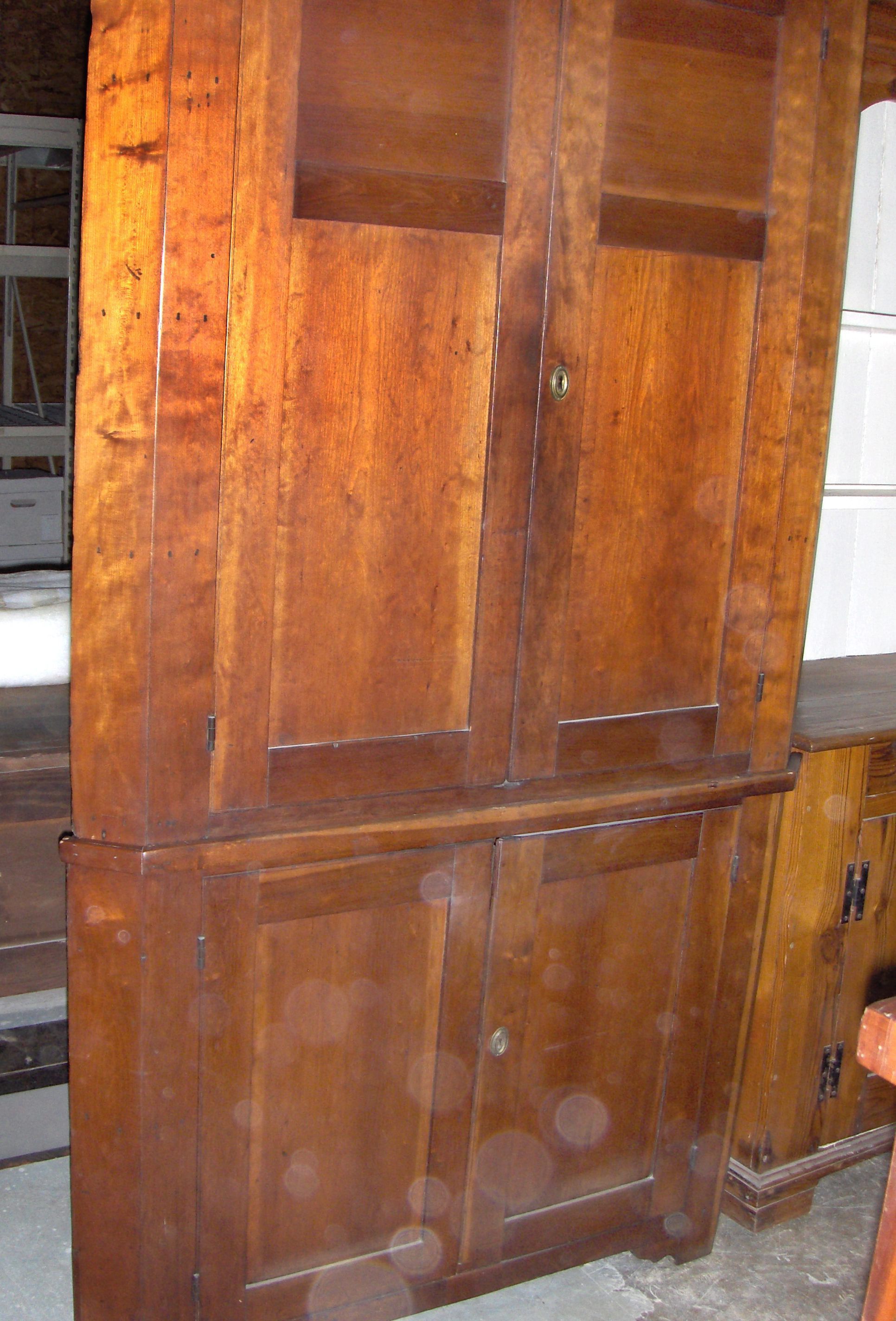 Cupboard, corner. 1825-1850. Cherry. Two parts. Solid doors with panel designs. May originally have been stained to resemble mahogany. 81"h x 44.5"w x 25"d. C,D: keys.Acquisition