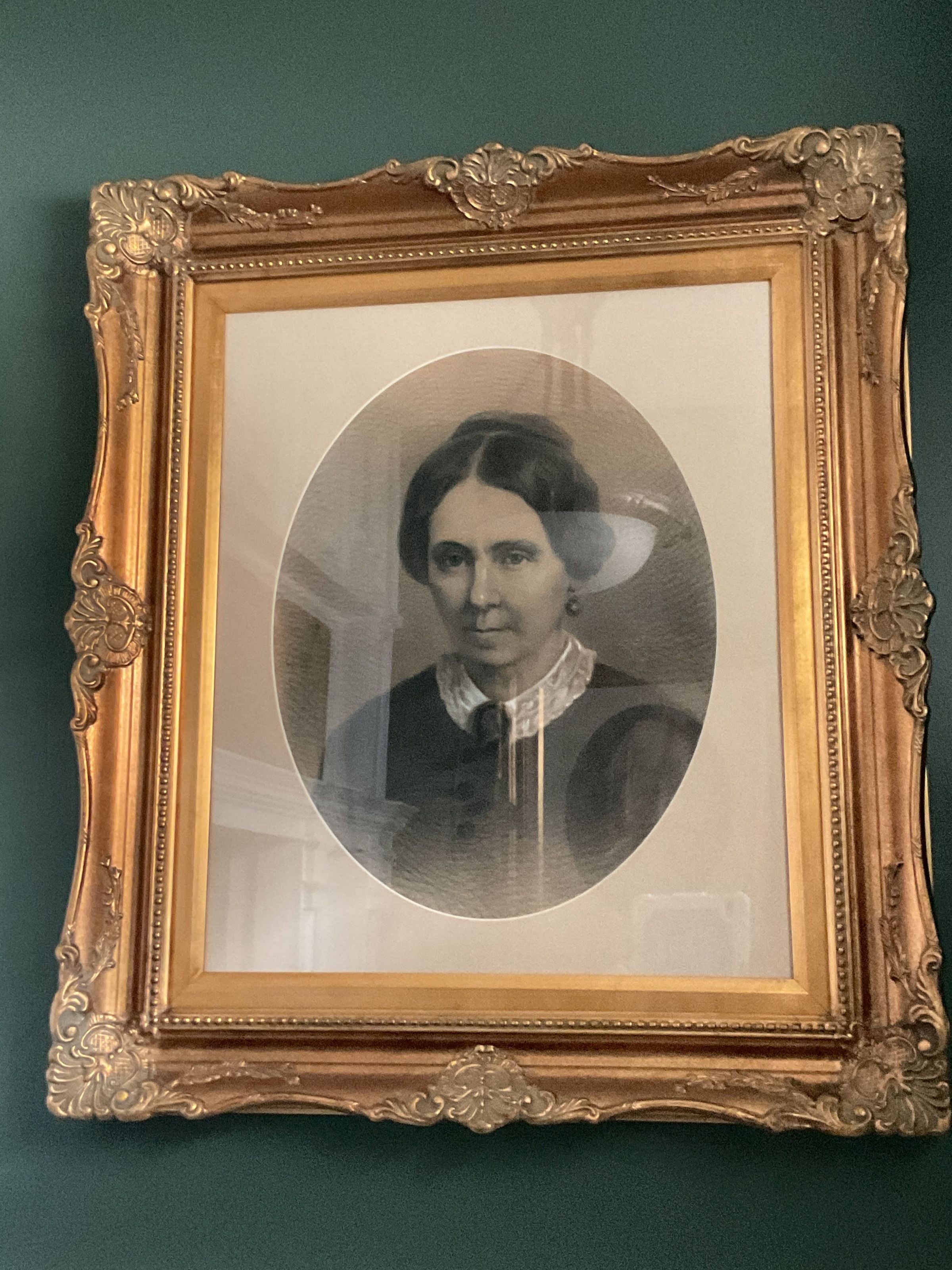 Drawing, charcoal and pencil. Charcoal portrait of an older woman looking to the left with black hair in a bun and parted in the center. Figure is wearing a dark buttoned dress with a high lace collar and large brooch, with one dangling earring visible to the viewer. Portrait has a white oval mat and gilded gold frame with scroll filigree detailing on corners.Context