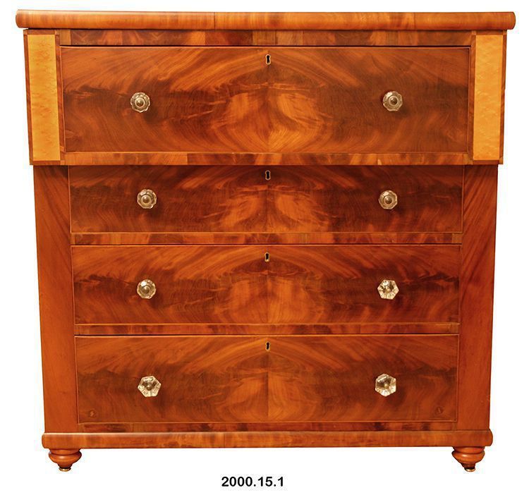 A: Chest of drawers. 43"h x 43"w x 22.75"d.; cherry case with mahogany veneered top and front; matched bookend veneer on each drawer front; bird’s-eye maple veneer panels flanking overhanging top drawer; tulip poplar secondary wood. Four drawers with cut glass knobs; knobs on bottom drawer and proper left side of third drawer have been replaced with pressed glass knobs. Signed on back "Jacob Glazier Union Town Feb 1 1838". May originally have been stained to resemble mahogany; traces of red wash are visible on back of case. B,C: keys. Lock hardware appears to be original, has hand cut screws.Acquisition
