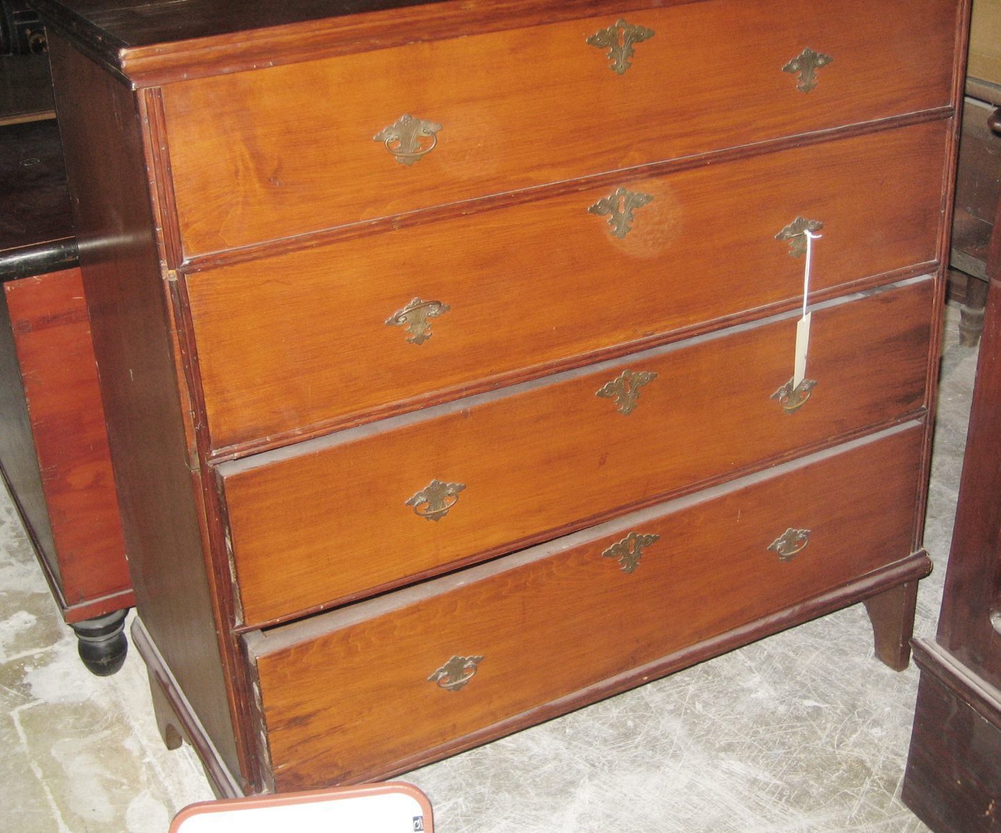 Chest of drawers. Plain rectangular top is hinged at back. Appears to have four drawers, however top two drawers are false and bottom two are functional. Four false brass escutcheons in center of drawer fronts, two small brass handles with C-shaped pulls. Bracket feet. 39.25"h x 38.25"w x 16.75"dAcquisition