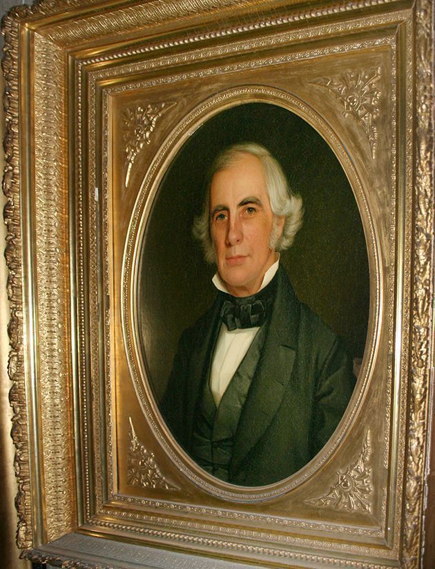 Painting. Portrait, oil on canvas, Benjamin Darby, torso, black coat, gray vest, black tie, light gray hair and sideburns; stretcher frame measures 30" x 25". Gilt and gesso frame measures 39.5" x 34.5" x 4", frame consists of a gilt mat with applied gesso detail with oval cutout and two separate surrounding frames, no marks, Baltimore, c. 1855.
