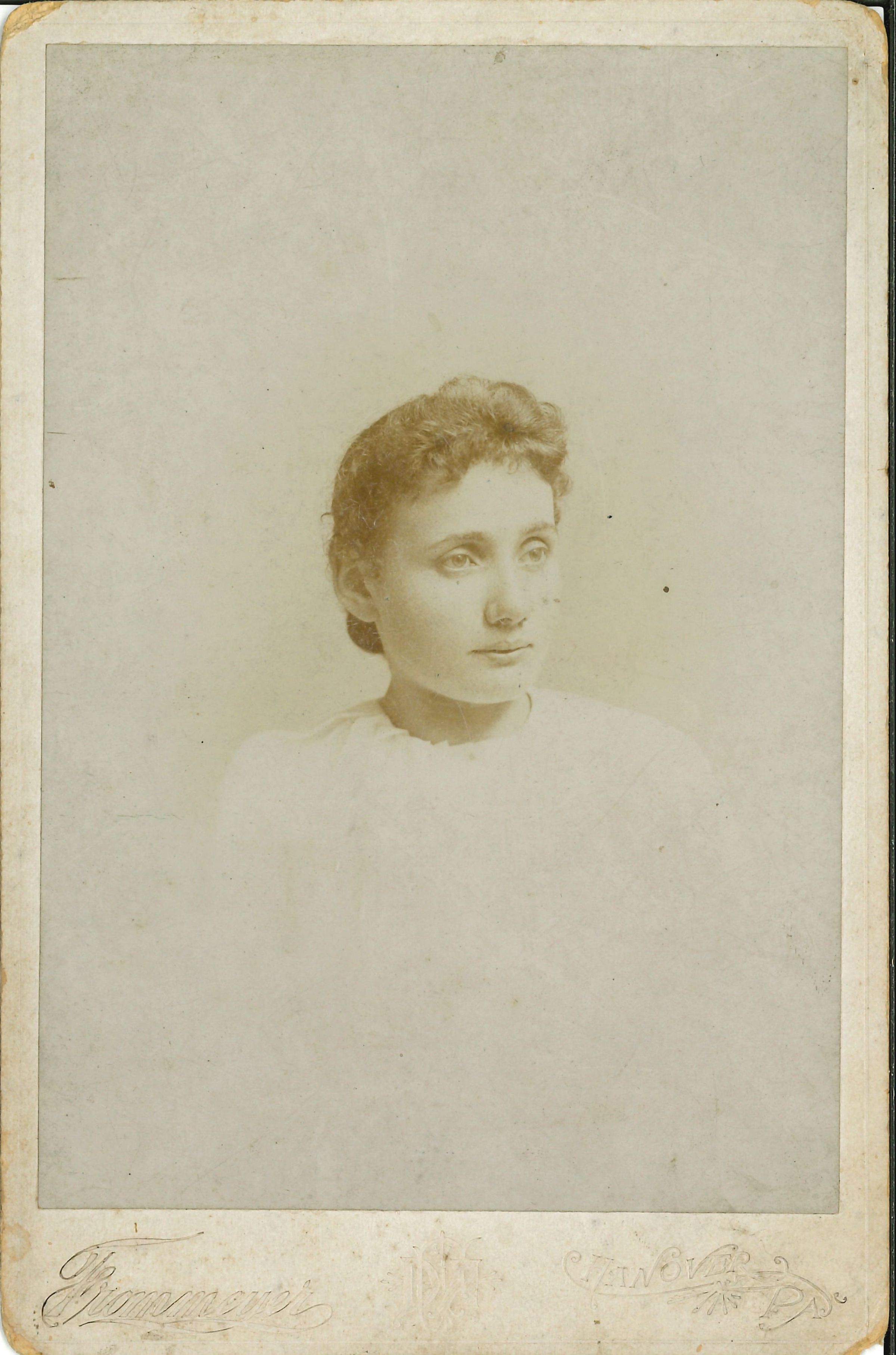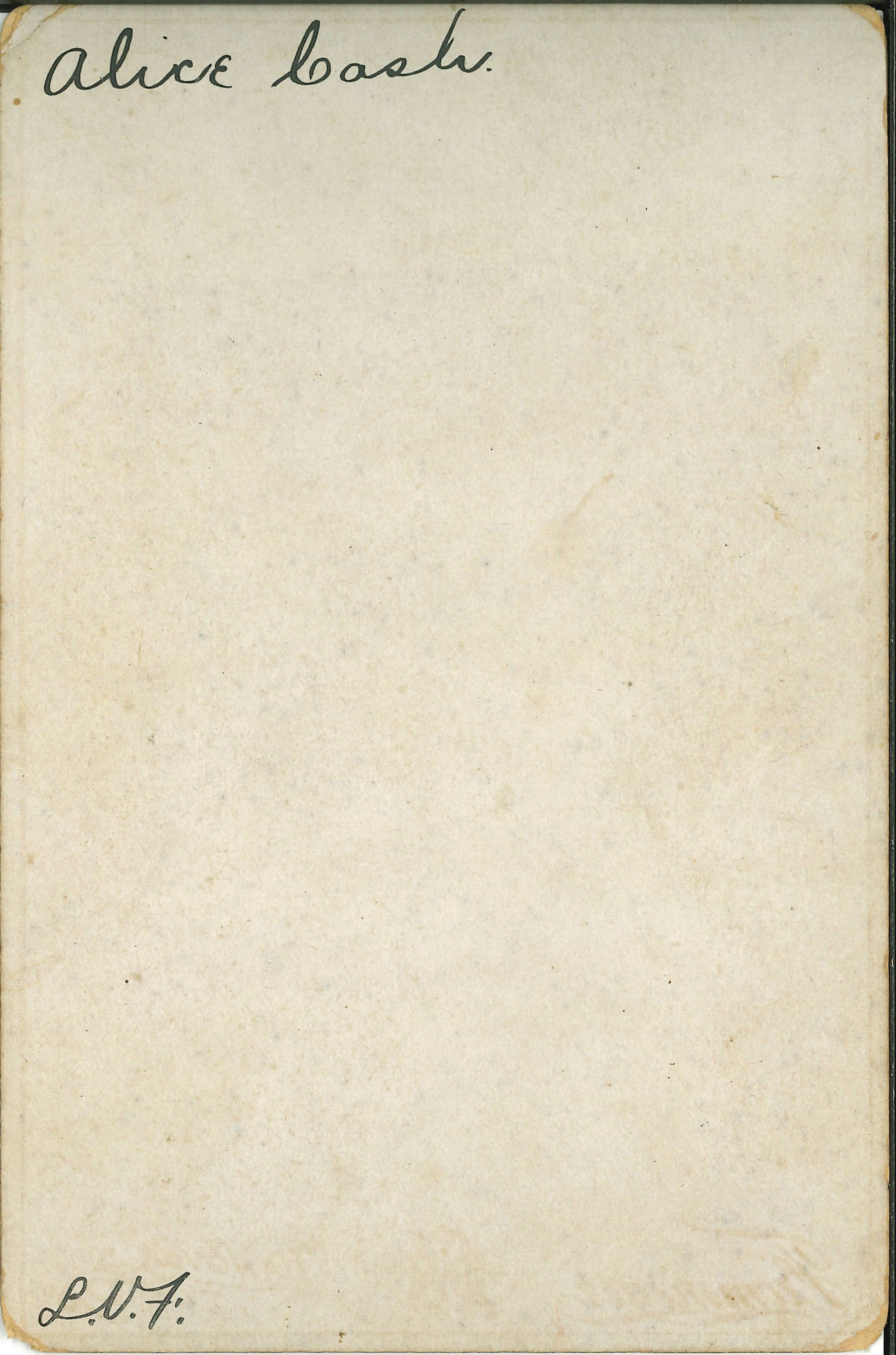 Print, photographic. B/W studio portrait of young woman, head and shoulders. Wearing a white dress, . Written on back in ink: Alice Cash.Photograph Details