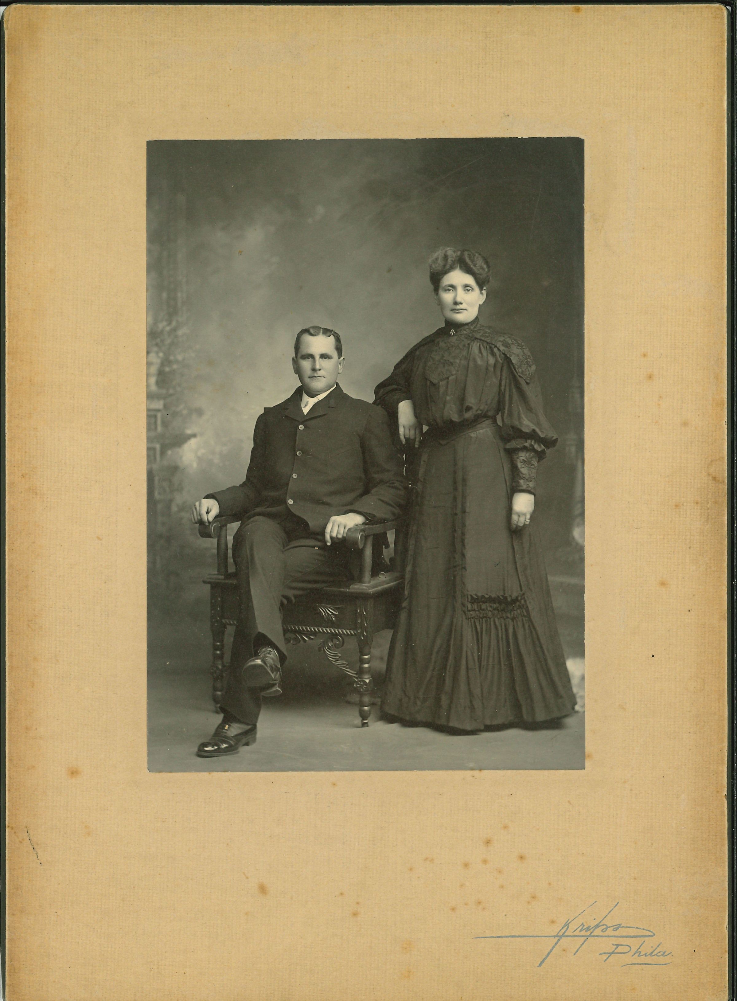 Print, photographic. B/W studio portrait of young couple. The man is seated in an ornate wooden chair, wearing a dark suit, legs crossed. The woman is standing wearing a dark dress. Written on back in ink: Frank Delaplane; Alice "Photograph Details