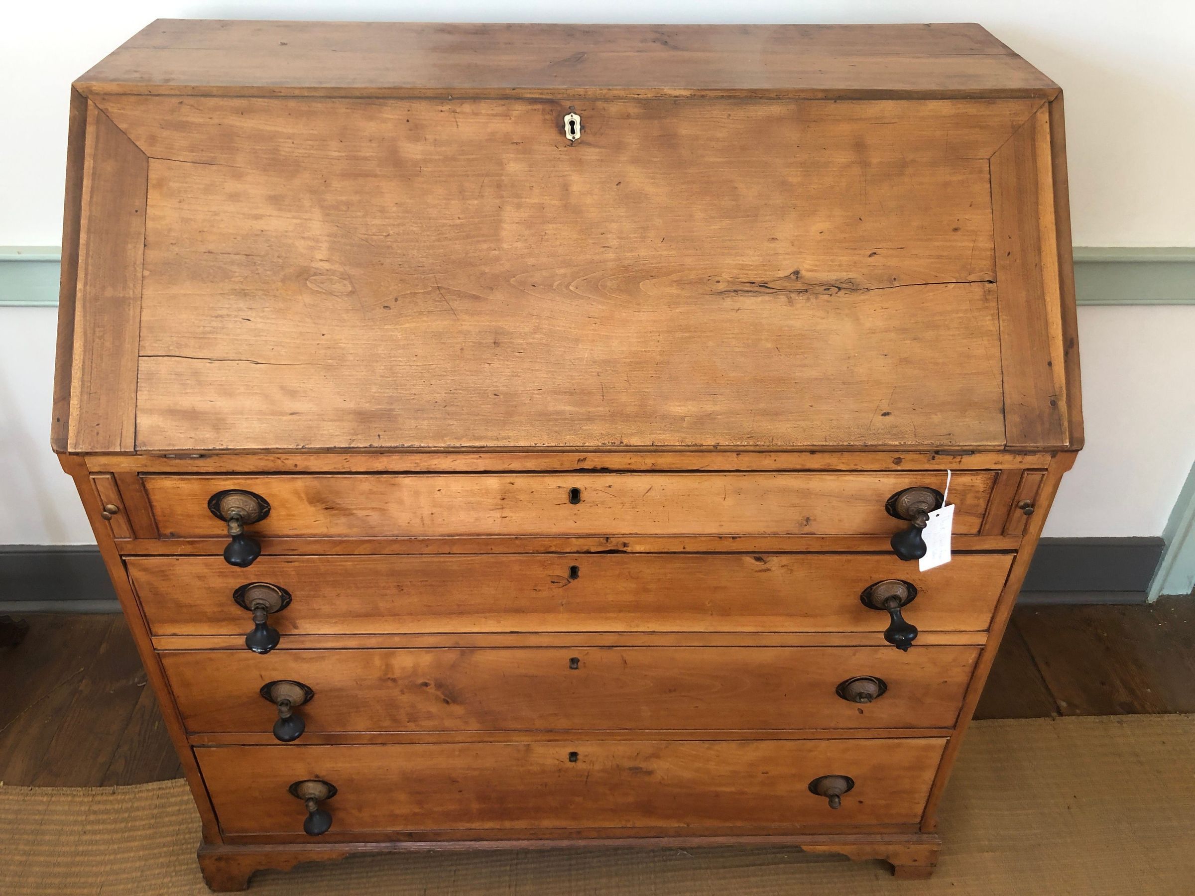 Desk, slant-front. Taneytown or western Maryland area, c. 1800. 41.5"h x 40"w x 20.25"d. Primary wood is cherry. Interior drawers have sides and back of yellow pine; bottom is poplar; front is walnut covered with a flame mahogany veneer. Document drawers have sides, back, and bottom of poplar; front is walnut with mahogany veneer. Prospect door is mahogany in a cherry frame. Hidden drawers have sides and back of yellow pine; bottom is poplar; front is walnut. Compartment box has wedged dovetails. Exterior bottom drawers have cherry front; sides, back, and bottom are poplar. There are a total of three drawers, consisting of two top drawers over a double drawer. The frame is poplar. The backboards are vertical tongue-in-groove poplar. Bracket feet. Locks are original; hinges have been replaced; the exterior drawers have c. 1875 pendant pulls placed over a black and gold painted medallion over location of original oval pulls.Acquisition