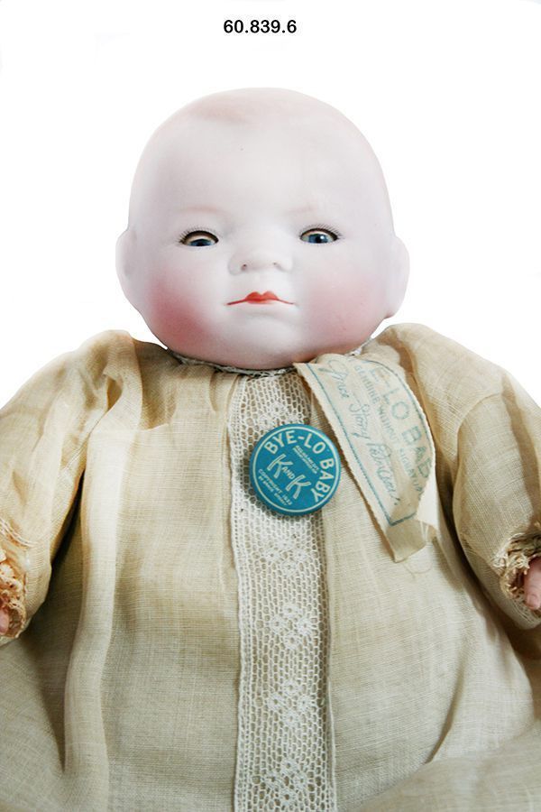 Doll. "Bye-Lo Baby", bisque baby doll, copyright 1922. Soft bent-limb cloth body. Wearing long white gown with lace trim. American.Acquisition