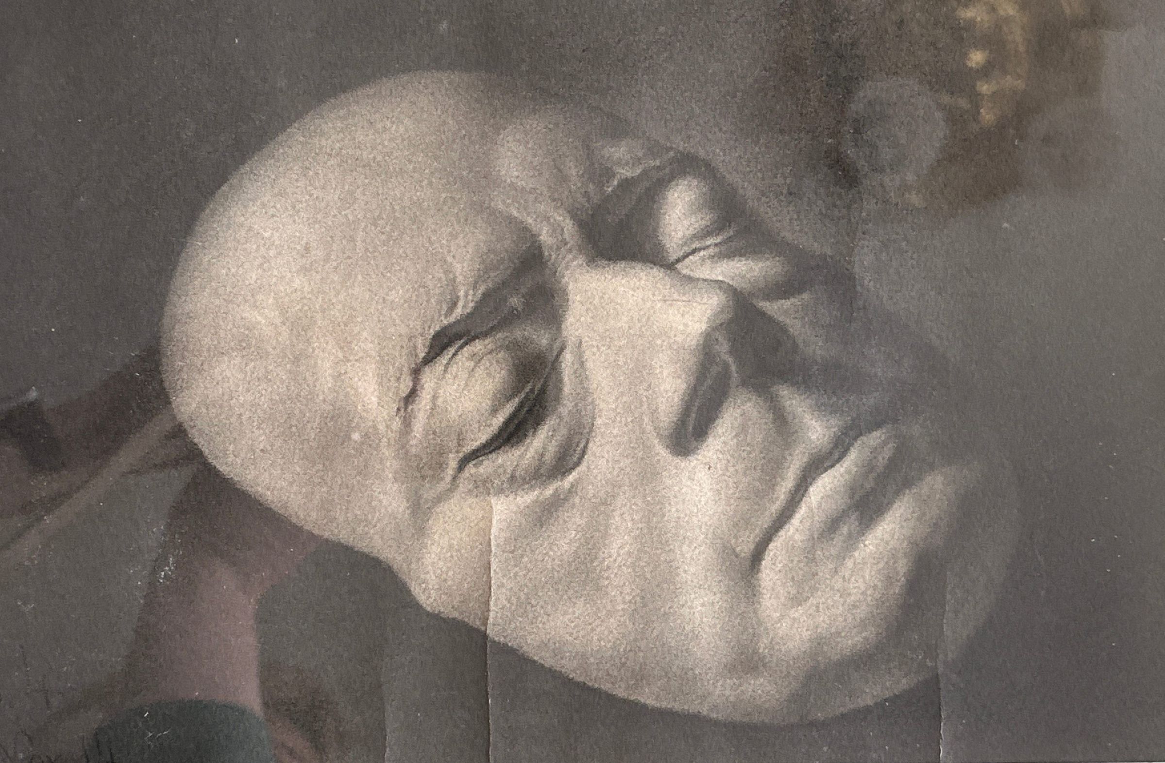 An original charcoal drawing of Beethoven’s death mask, c.1870, drawn by Frederick Dielman as an art student in Germany. Removed from frame due to water damage.Type of Drawing
