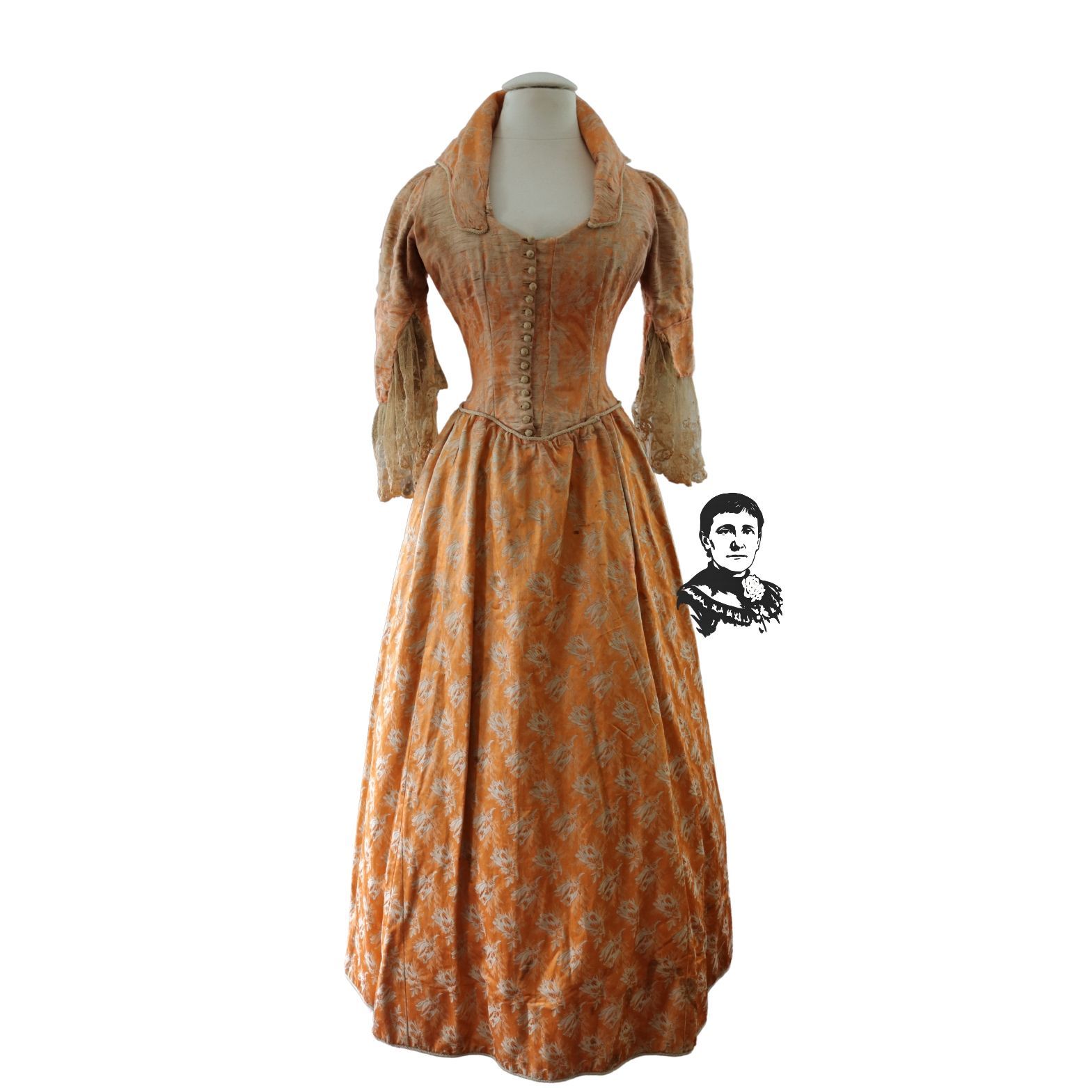 This dress, which belonged to Mary Bostwick Shellman, is a Reception Dress of orange silk satin with beige brocaded floral motifs, dating from around the early 1880s. This full-length, one-piece dress features a square neckline with a standing collar in the back, a button-front bodice, and a full skirt with bustle fullness in the back. It has ¾ length sleeves that were later altered. The dress is fully lined with brown cotton.Context