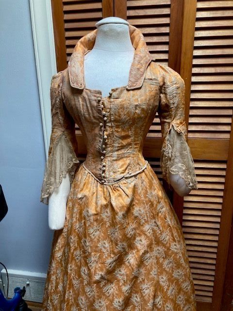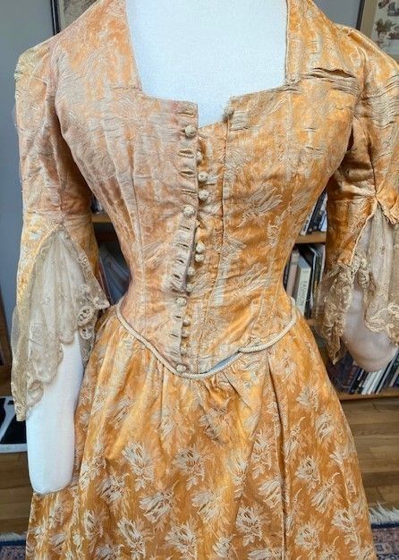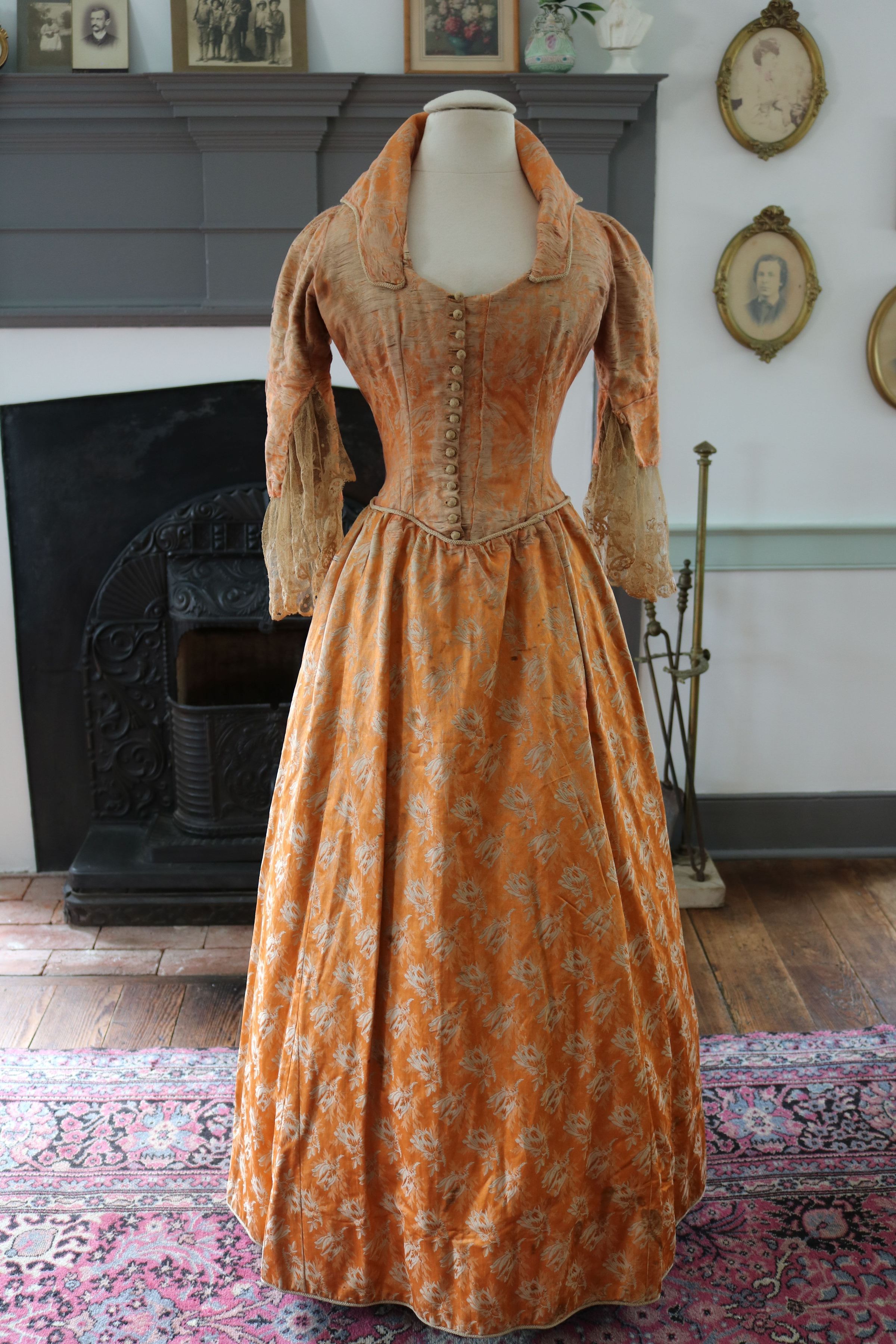 Original deed of gift reads "Orange-Satin brocaded dress of grandmother of Mary Shellman. Worn by Mary Shellman for an oil painting."