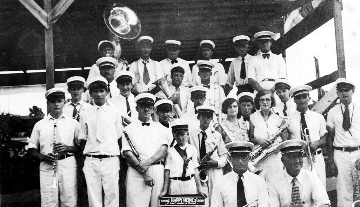 Print, photographic. E. Snyder & Son Band. B/W photograph showing a large group of men and boys in white outfits with white hats and instruments. There are two women in the front right of the group. A young boy in front is holding a "Happy Heine" cigar box. Two men are crouched down in front. On back in pencil "George Snyder is in the 2nd row from the bottom, second from the left." There is a sticker on the back also that is blue and white and reads "Smoke a Happy Heine 5 cent cigar A trial makes a friend Very Mild - Try One E. Snyder & Son Makers Hampstead, MD" In blue ink "Ann Band". 4.75" x 3" c.1910.