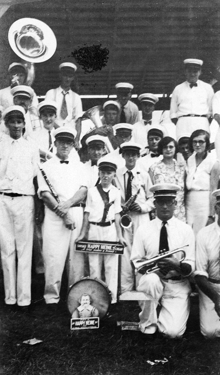 Print, photographic. E. Snyder & Son Band. B/W photograph showing a large group of men and boys in white outfits with white hats and instruments. There are two women in the front right of the group. A young boy in front is holding a "Happy Heine" cigar box. Two men are crouched down in front. On back in pencil "George Snyder is in the 2nd row from the bottom, far left." There is a sticker on the back also that is blue and white and reads "Smoke a Happy Heine 5 cent cigar A trial makes a friend Very Mild - Try One E. Snyder & Son Makers Hampstead, MD". 3" x 4.75". C.1910.