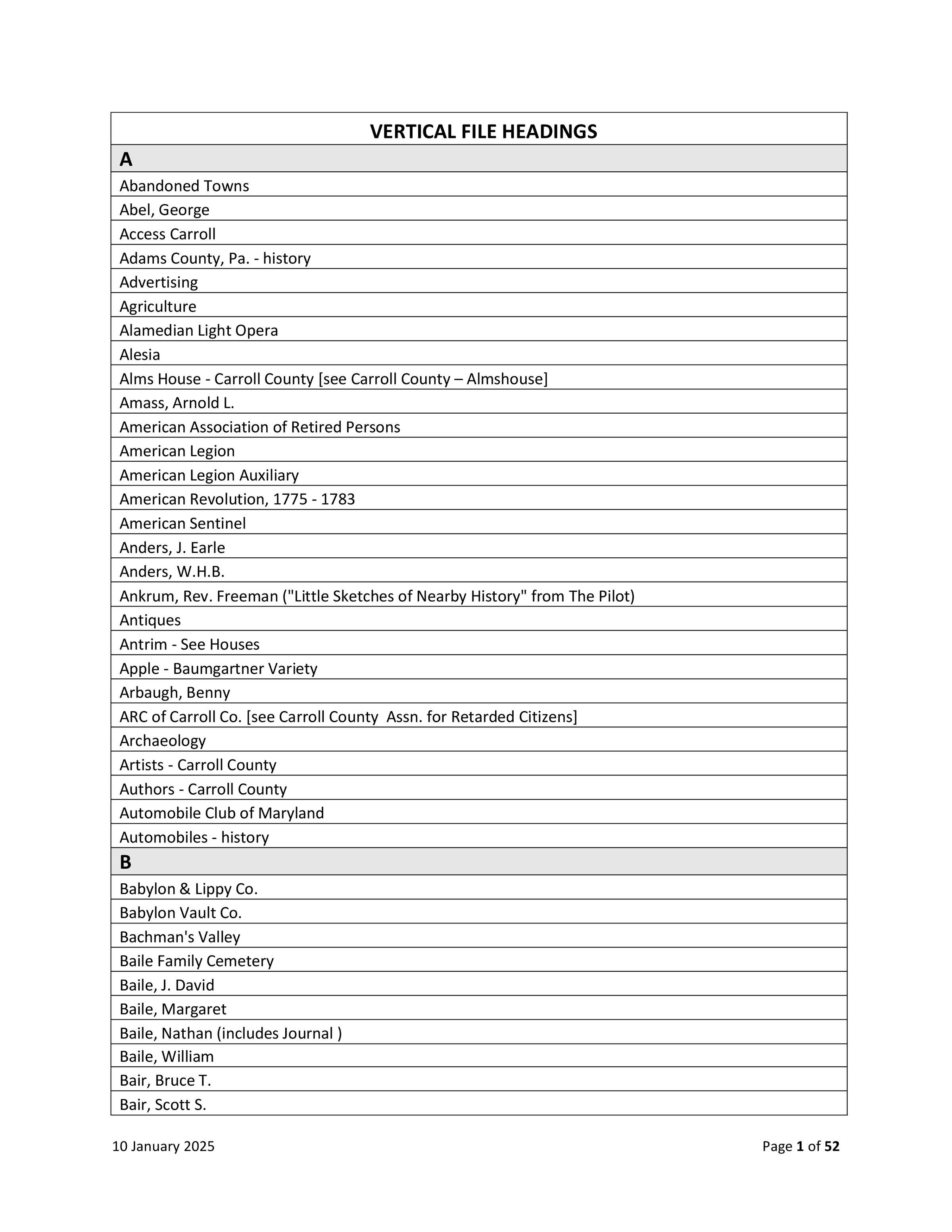 The Vertical Files in the research library hold numerous newspaper clippings, pamphlets and other ephemeral material collected by the Historical Society. Folders organized by town, organization, event and person provide information for a variety of research topics. These files are available during regular library hours.