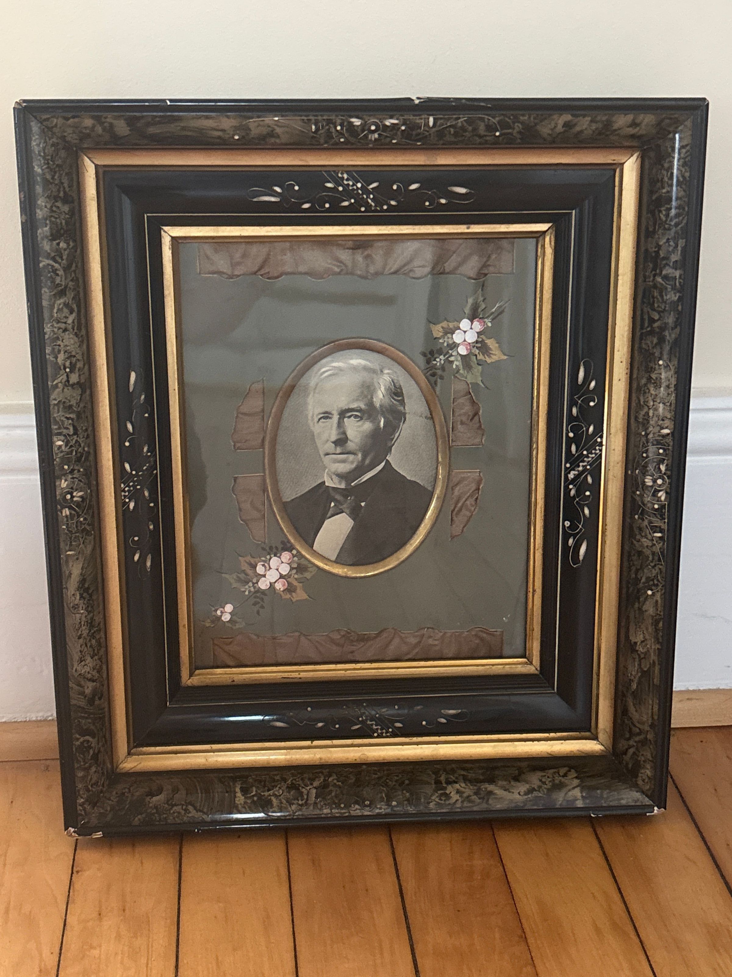15.5"h x 13.25"w x 2.5"d. Rectangular wood frame, green marble-like inlay, brass trim, carved designs. Mat is gray with brown silk showing through, handpainted floral designs. Black/white image of man.