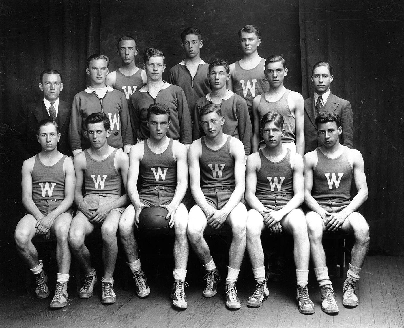 Print, photographic. B/W image of Westminster High School basketball team, c.1930. Shows 12 young men in jersey's with "W" on the front and shorts; two men in suits. One in front row is holding a basketball. 7.75" x 9.75"