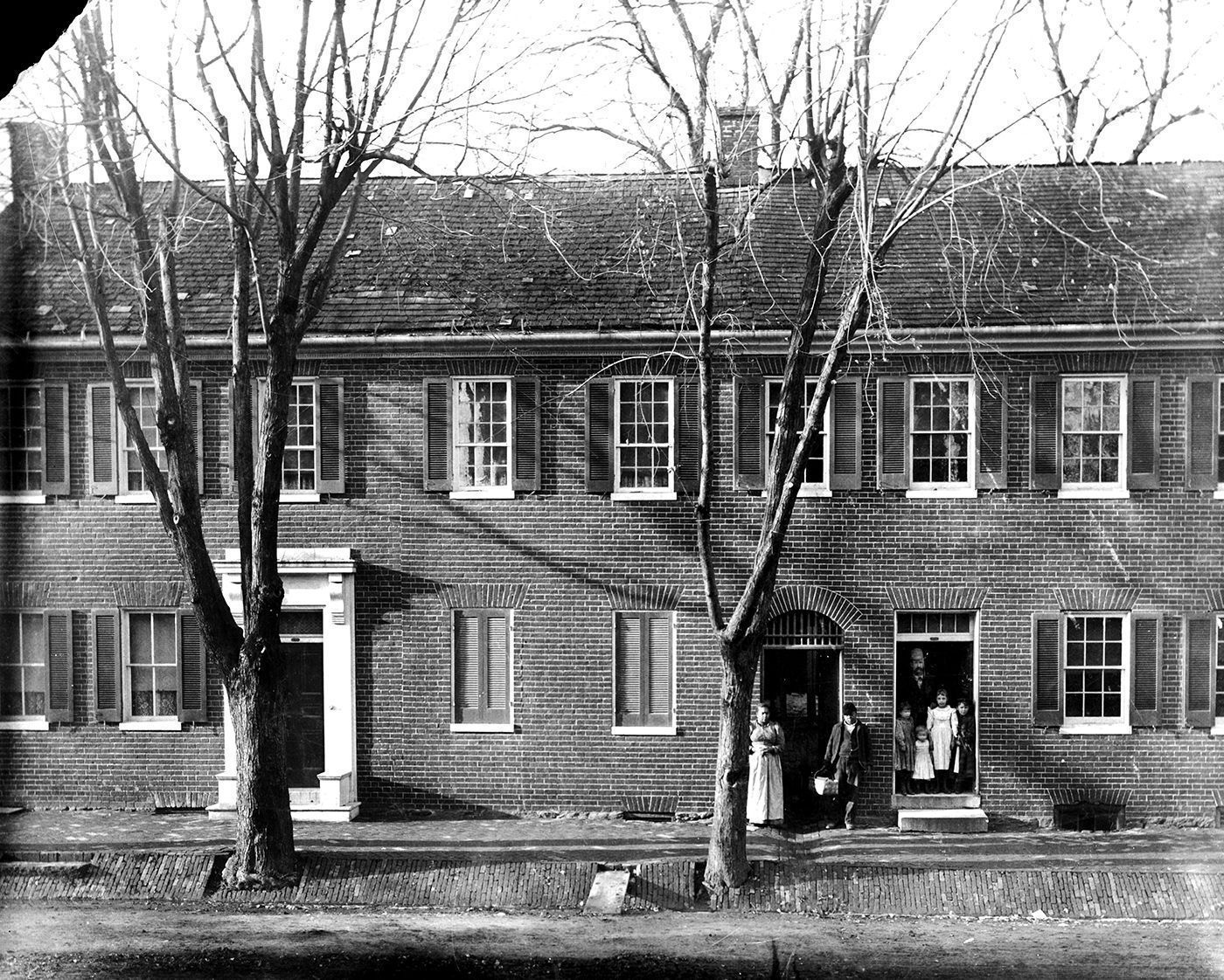 Black and white photograph of the Jones House on Main Street in Westminster. The photograph features a row of two story brick town houses with a group of people in the door in the proper right side of the photograph. A man and woman stand outside the house on the sidewalk, the man with a basket in his hands. The photograph is not mounted or matted and measures 6.5"x 8.25".