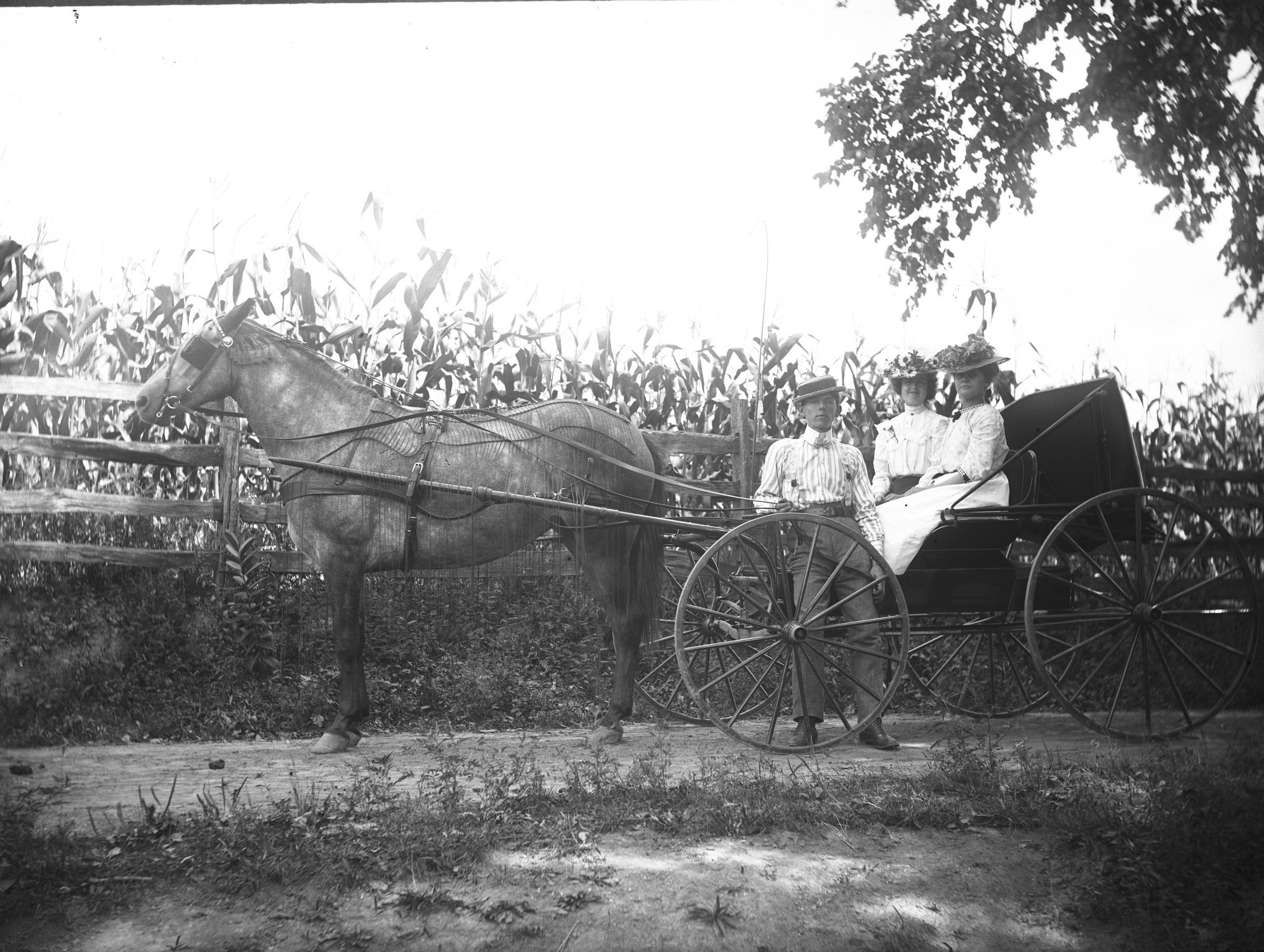 horse & buggy, 1 man, 2 women, front of corn fieldContext