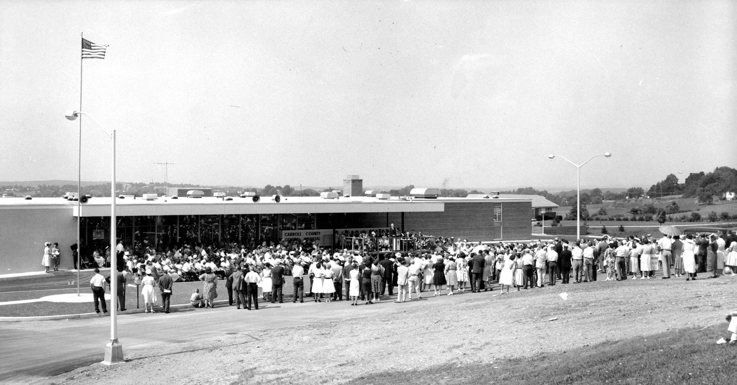 Black and white image of exterior with large crowd of people facing one-story building. Undated. Very difficult to determine portion of Carroll County General Hospital in this photograph. Overall size: 4.0" x 5.0". Image size: 2.5" x 4.5". Also copy print of same photo. Overall size: 8.0" x 10.0". Image size: 5.0" x 9.5"