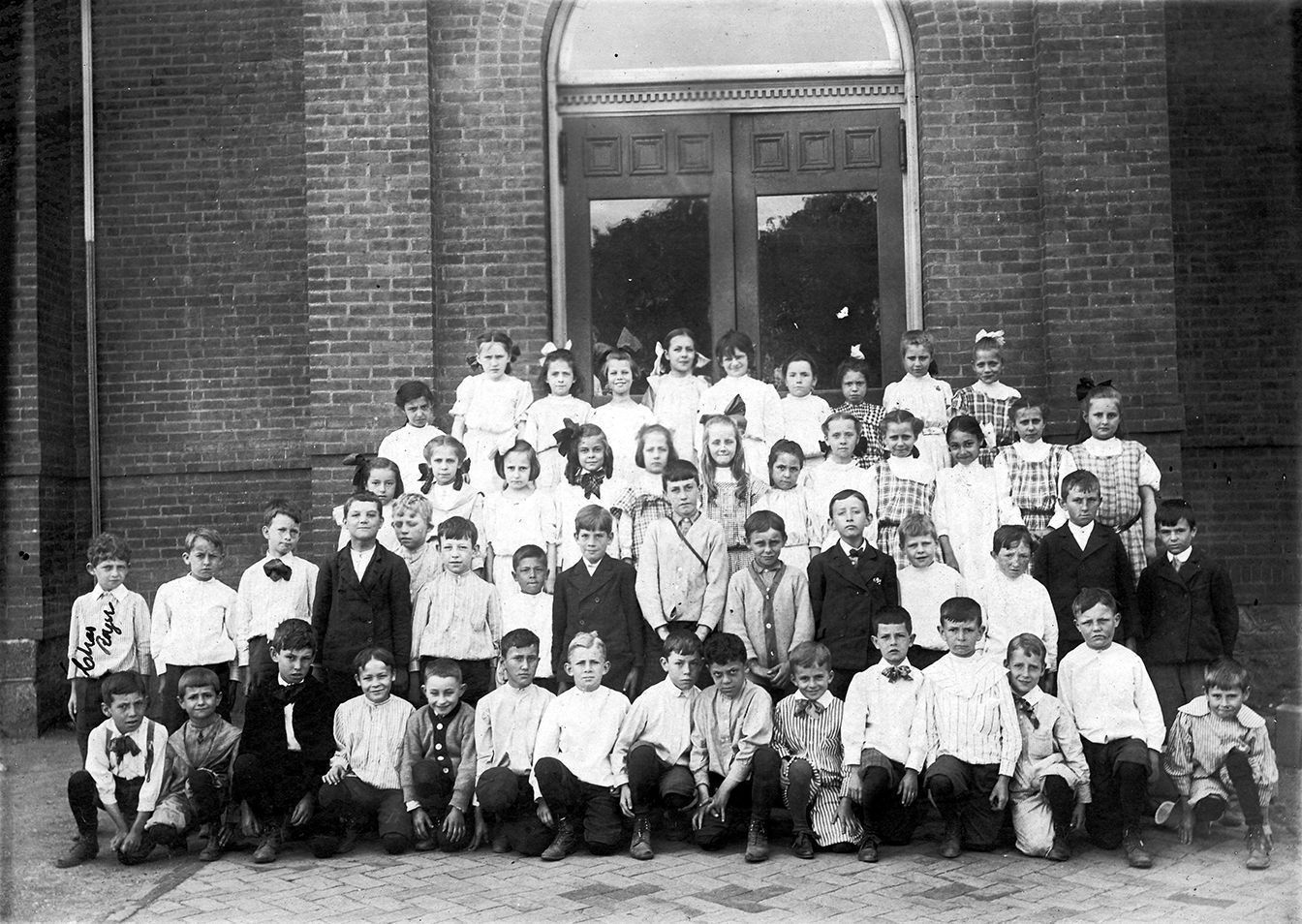 Print, photographic. 2nd grade at East End School [Westminster High School]; Charles Royer identified in ink; standing at left end of second row. Students sitting and standing on steps in front of brick building. No teacher in photo. Boys first two rows, girls back two rows. Photographer unknown. Mounted. Written on front of matte: "2nd Grade at Westminster High School." Overall size: 8" x 10". Image size: 5" x 7". C.1890.Acquisition
