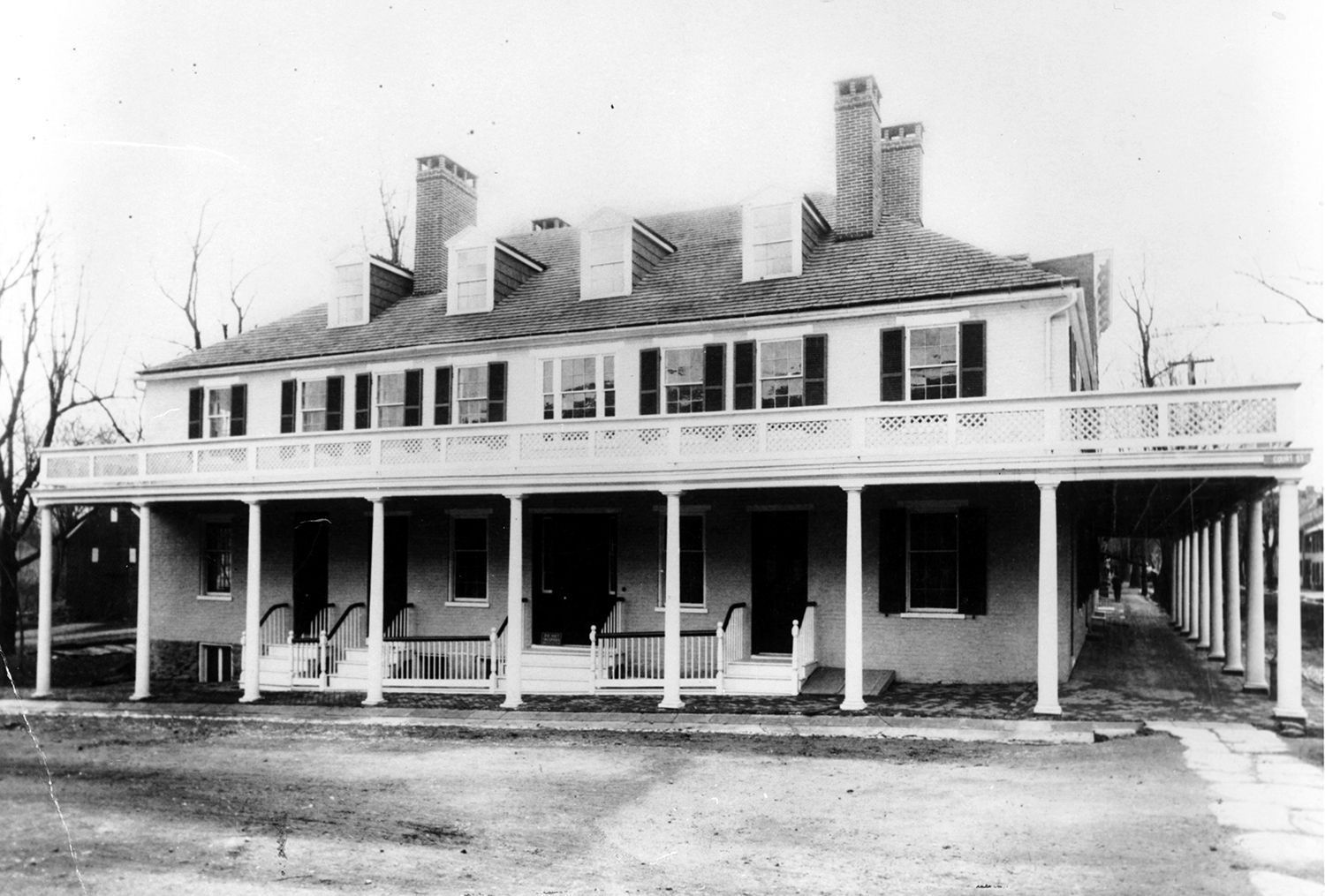 Blackand white photograph (not mounted or matted) presenting the Main Court Inn in Westminster, MD. The Inn has a large upper deck wrap-around porch supported by large, white columns. There is a stone walkway to the right of the photograph in the foreground. The overall measurements are 8"x10", actual image size: 7.5"x9.5".