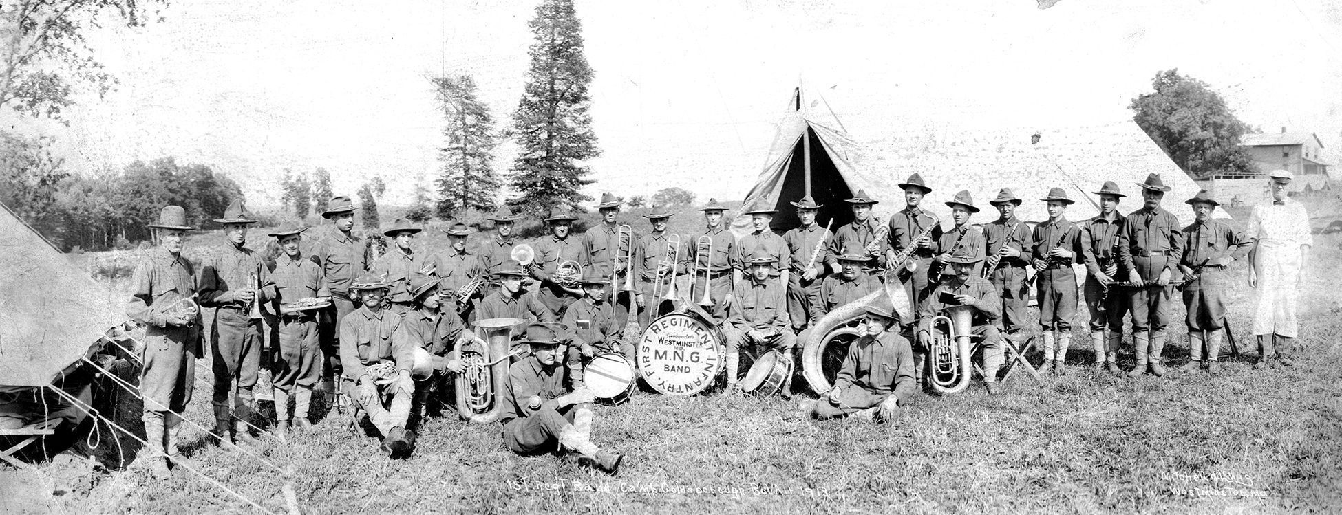 Black and white oblong photograph featuring the 1st Regiment Band at Camp Goldsborough in Westminster, MD in 1913. The photograph features various men of different instruments of various ages. The camp features two tents. The photograph is mounted on a piece of thin cardboard tag. The overall size 8" x 19.75".