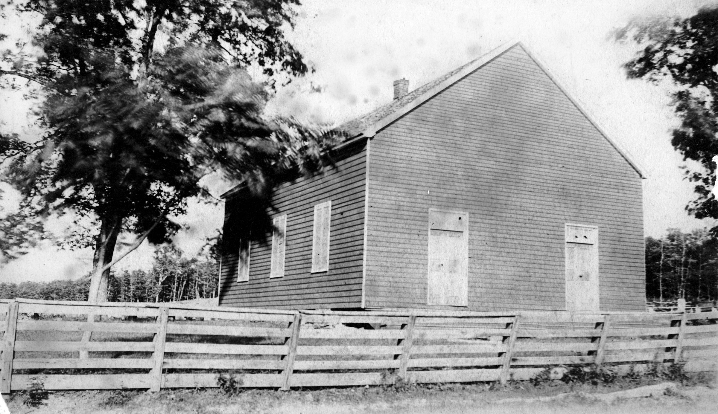 Print, photographic. Ebenezer Methodist Church, Winfield (Old). B/W photo of a clapboard building behind a plank fence. The front of the building is facing the fence and has two wooden doors, one to the right and one to the left. The left side of the church has three windows across. There is a small chimney in the middle of the roof. There is a tree to the left of the church. Photo: 5.25"x8.5"