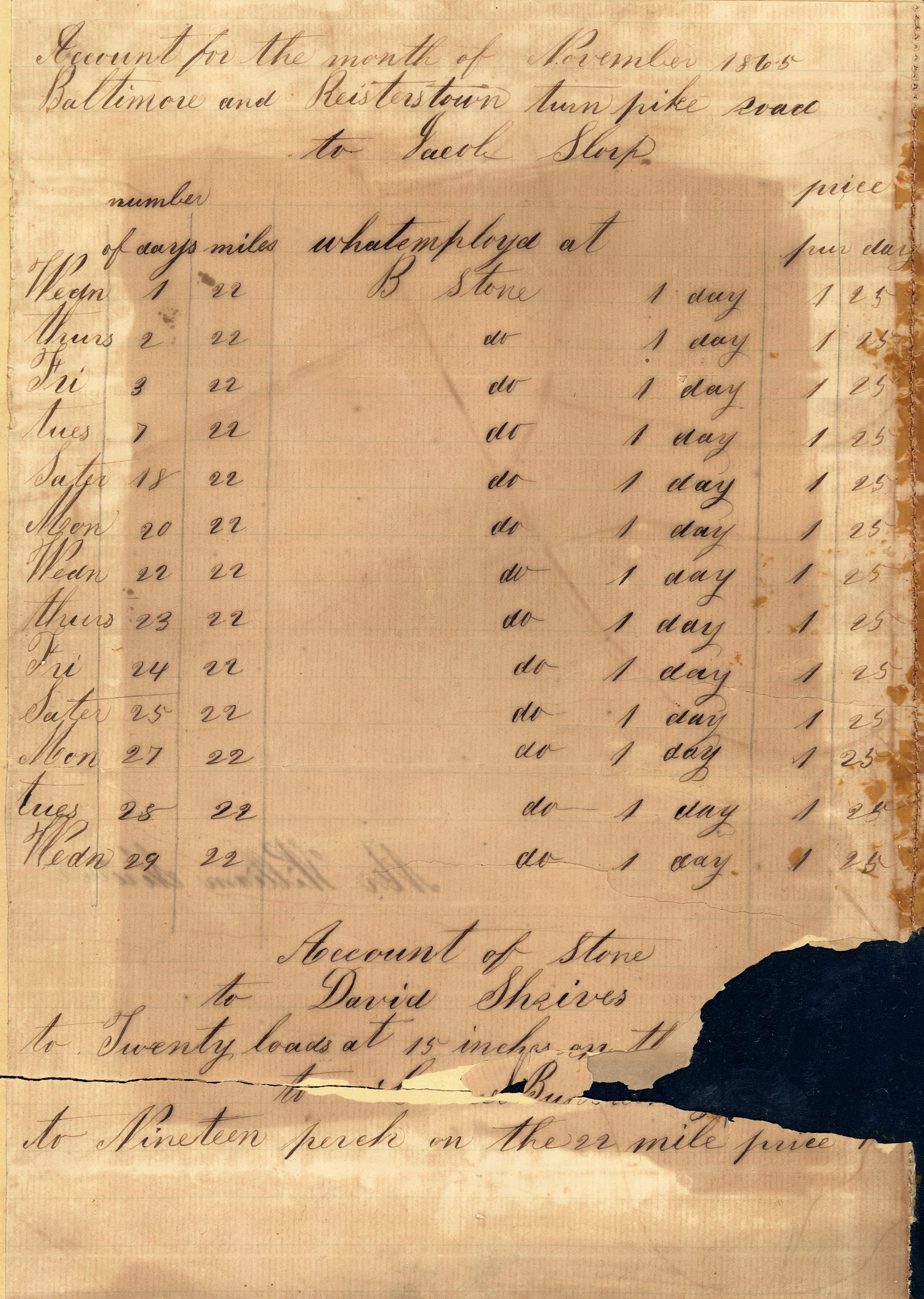 Records. Regarding the Baltimore and Reistertown turnpike, 1865. Four pages, glued back-to-back on 2 sheets of heavy, acidic card stock.