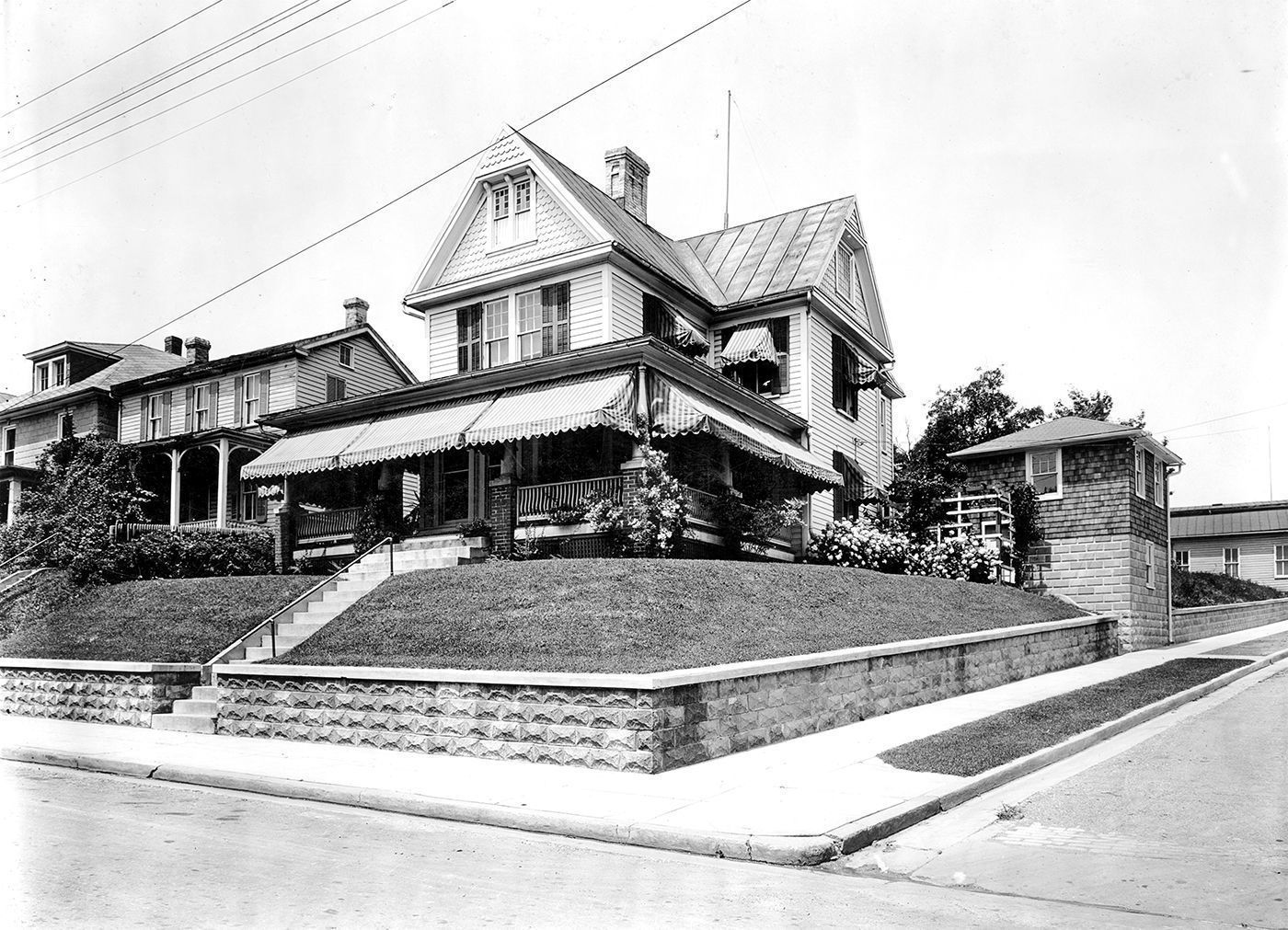 Black and white photograph of the Eckenrode House on Liberty Street in Westminster. The photograph features the house with striped awnings coming off of the wrap-around porch and flower garden in the proper right side on the photograph. The photograph is mounted and measures 8.00"x 9.75".