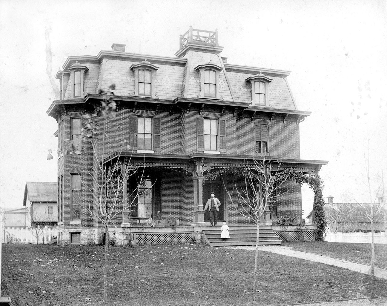 print, photographic. B/W photograph of Nathan Englar's home in Linwood. The photograph features the three story brick home with a full length front porch with elborate roof line. The photograph is mounted on cream matboard with gold detailing around the edge. Inscription on the back reads, "Nathan Englar (1853-1911), Linwood - Late 1880's, and son Roy Englar (1886-1965). House built 1884-1886. Note Cupalo,: trap door led to flat roof." Overall measurements are 9.875" x 12"; image size is 7.25" x 8.75".Acquisition