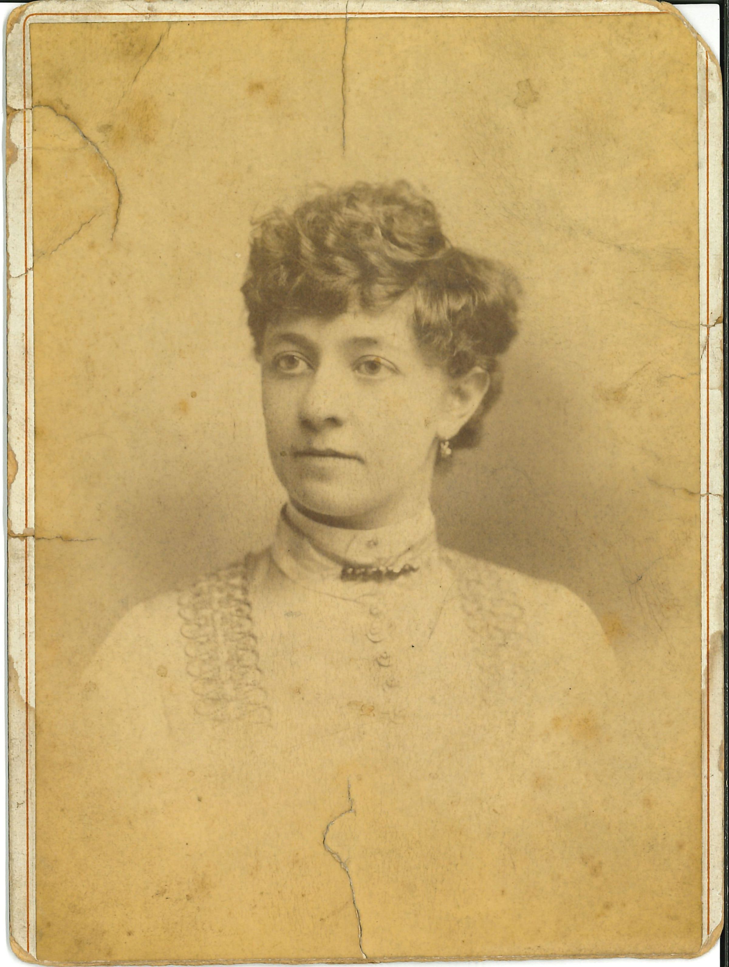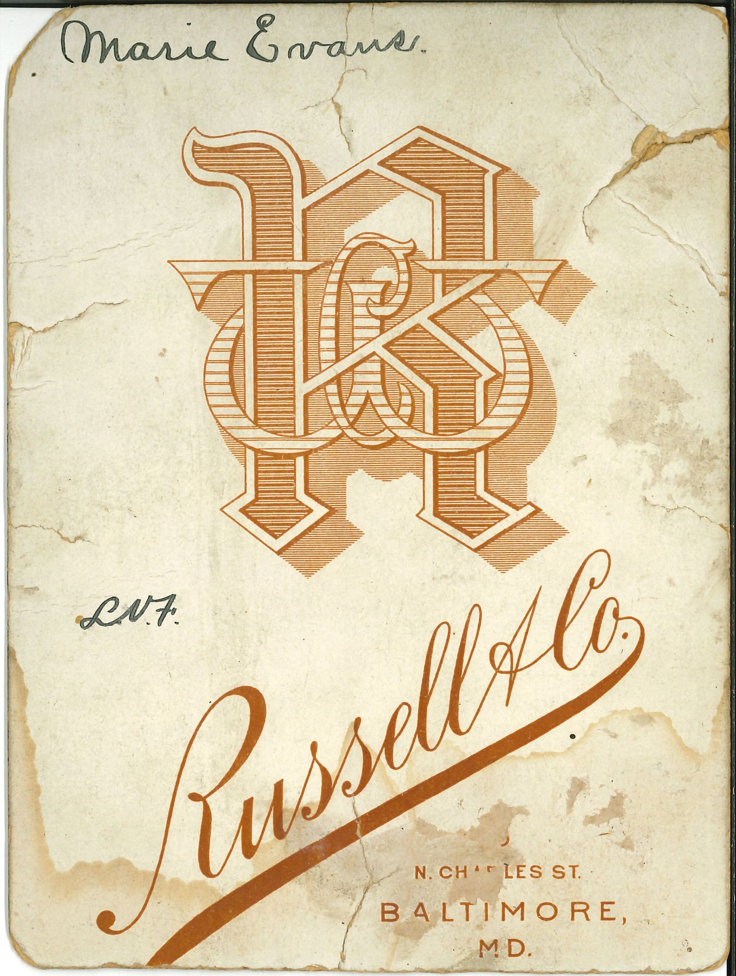 Print, photographic. B/W studio portrait of young woman, head and shoulders. Written on back in ink: Marie Evans. Russell & Co. Baltimore, MDPhotograph Details