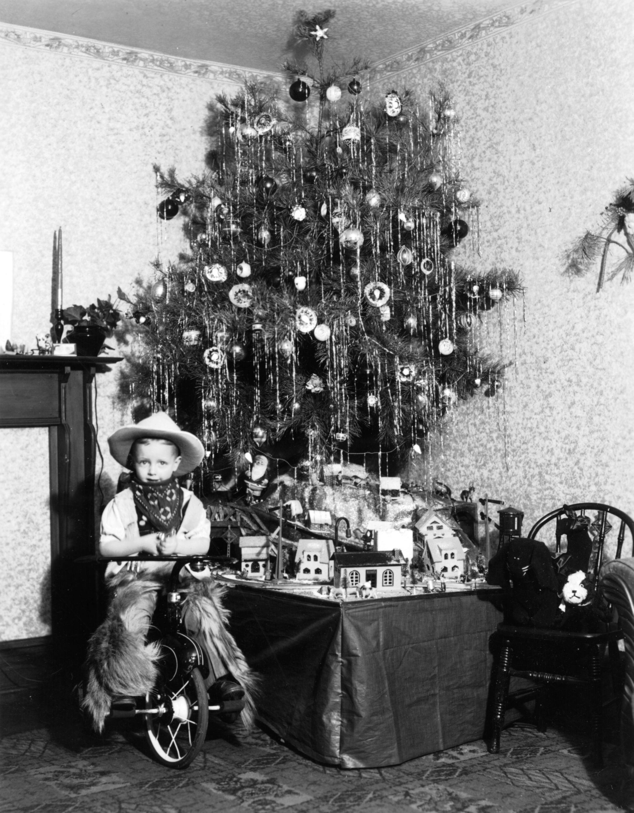 Print, photographic. B/W photograph of Sterling D. Evans, Christmas, 1937. Sterling is a boy, dressed in a cowboy costume, seated on a tricycle. There is a Christmas tree on the table behind him; there is a Christmas village on the table. 5.125" x 4".Acquisition