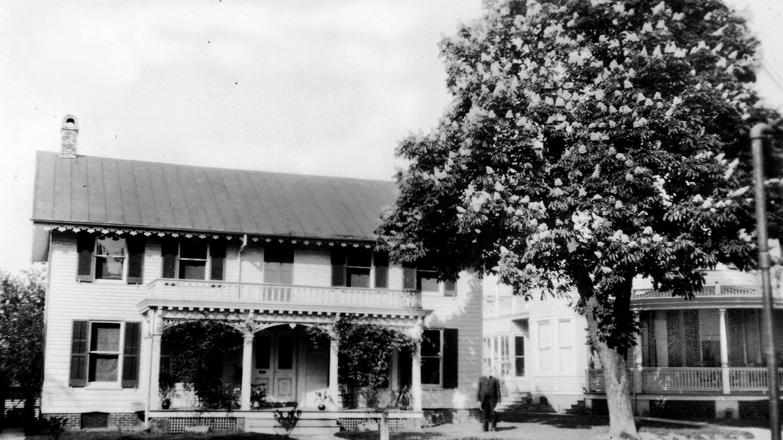 Print, photographic. B/W print, 3.5" x 5.75", of the exterior of the Ezra Bish house on W. Main St., Westminster. The home has a scalloped trim along the roof line and a large front porch with a balcony top. Written in ink on front is "Ezra Bish property - site of Carroll movie"; on back is written "Bish property W. Main St. Site of Carroll Theatre". A stamp in the bottom corner reads, "Collection of J. Leland Jordan".Acquisition