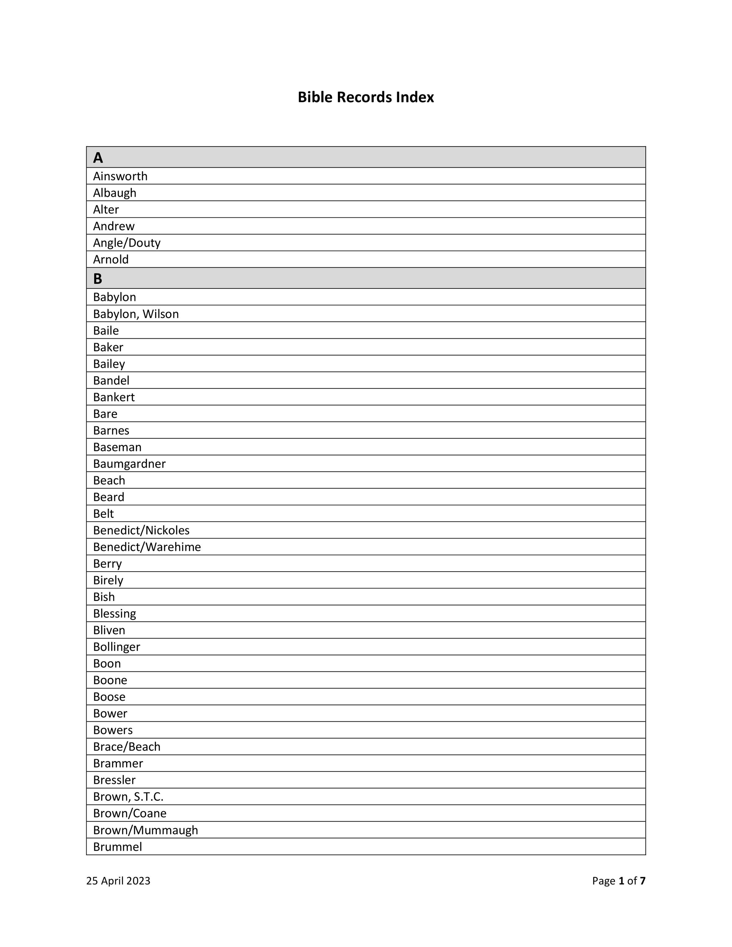The following is a list of the Bible Records at HSCC, listed in alphabetical order by last name.