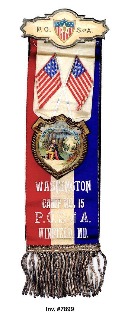Ribbon, fraternal. Patriotic Order Sons of America. " WASHINGTON CAMP NO. 15 P.O.S. of A WINFIELD, MD." Sillk ribbon with red, white and blue vertical stripes. Bar across top has silver color frame surrounding white celluloid panel; panel has red, white and blue shield at center, reads "P. O.S. OF A." White silk ribbon suspended from bar overlays striped ribbon; shield-shaped medallion with picture of George Washington kneeling in snow suspended at bottom; crossed American flags appliqued at center. Silver braid across bottom. Reverse is black silk with silver lettering; IN MEMORIAM WASHINGTON CAMP NO. 15 P.O.S. of A WINFIELD, MD." 9.5"h x 3"w.