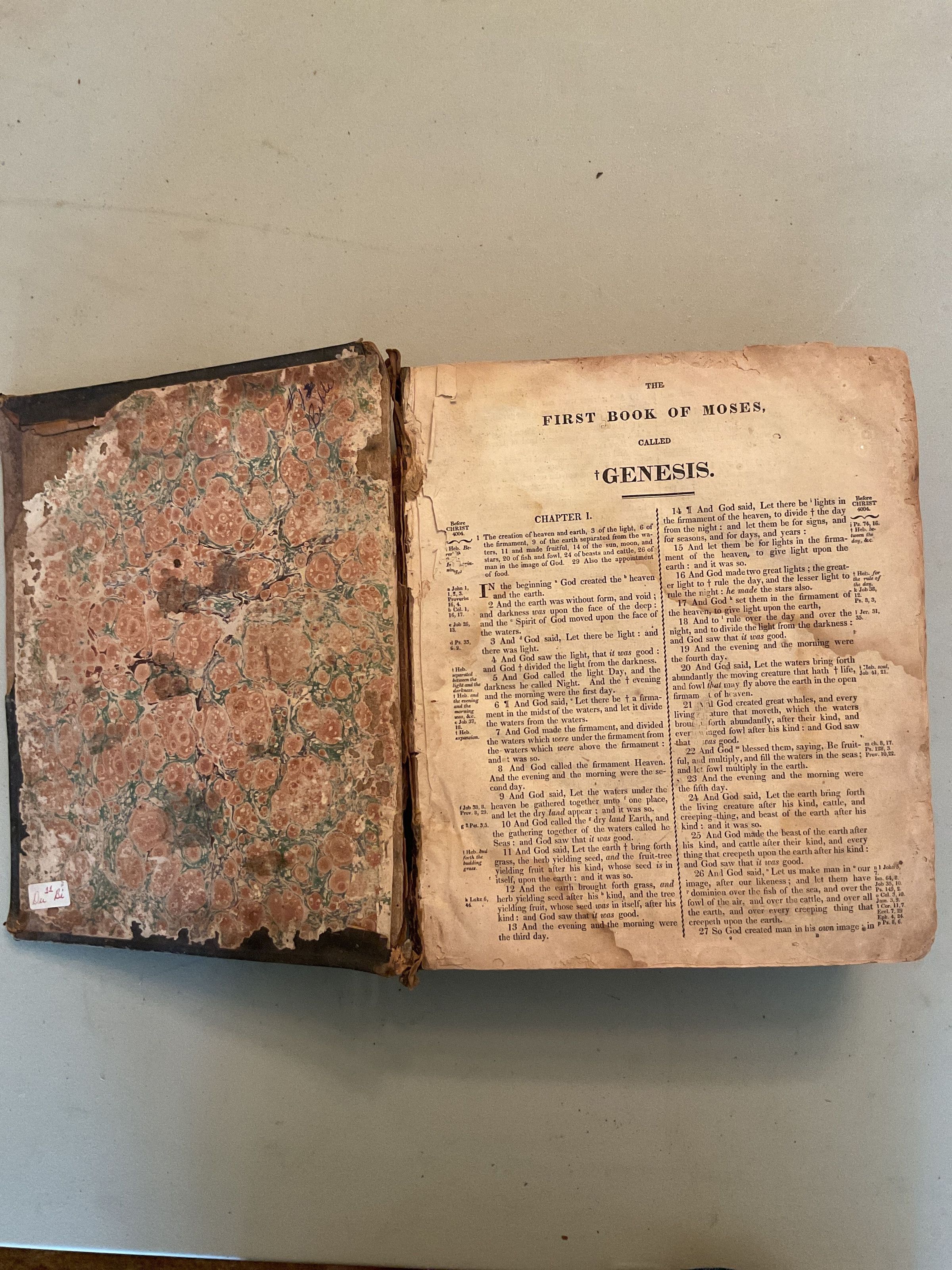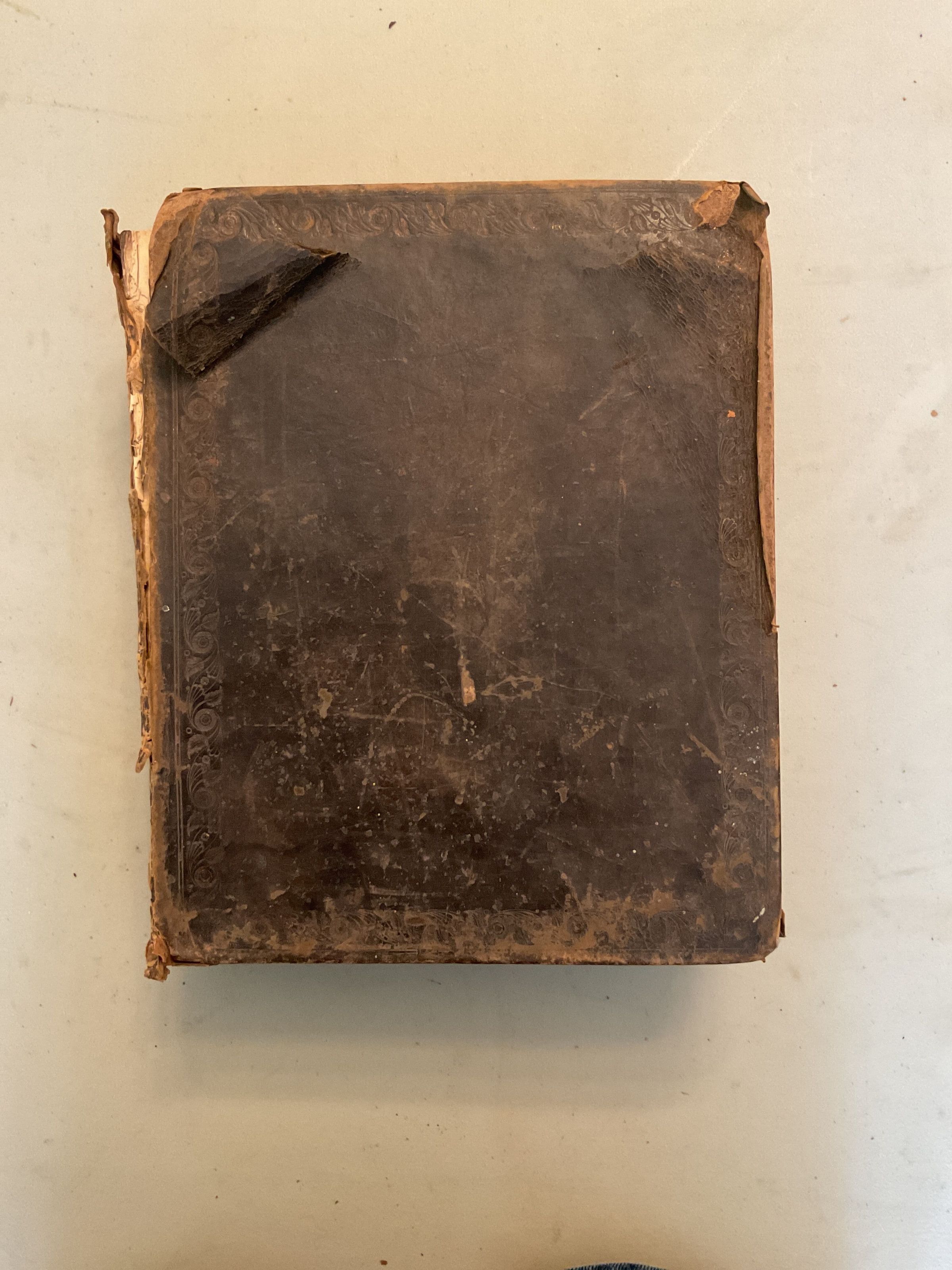 Old and New Testament published in Boston in 1827. Condition is poor, leather is peeling and front cover completely detached. Missing pages.
