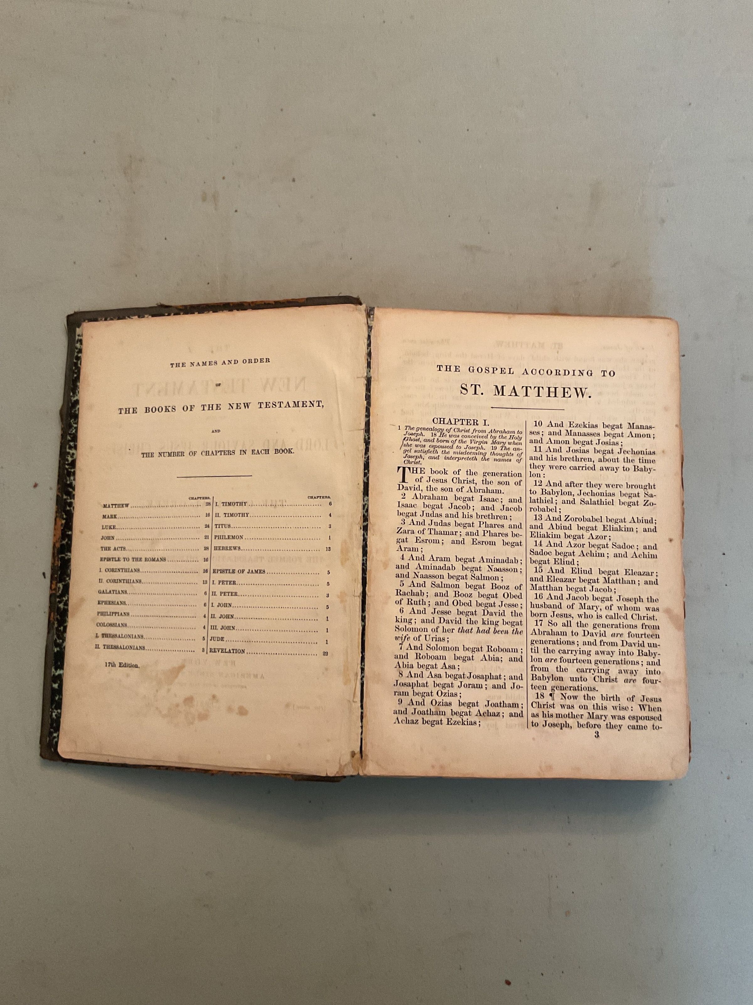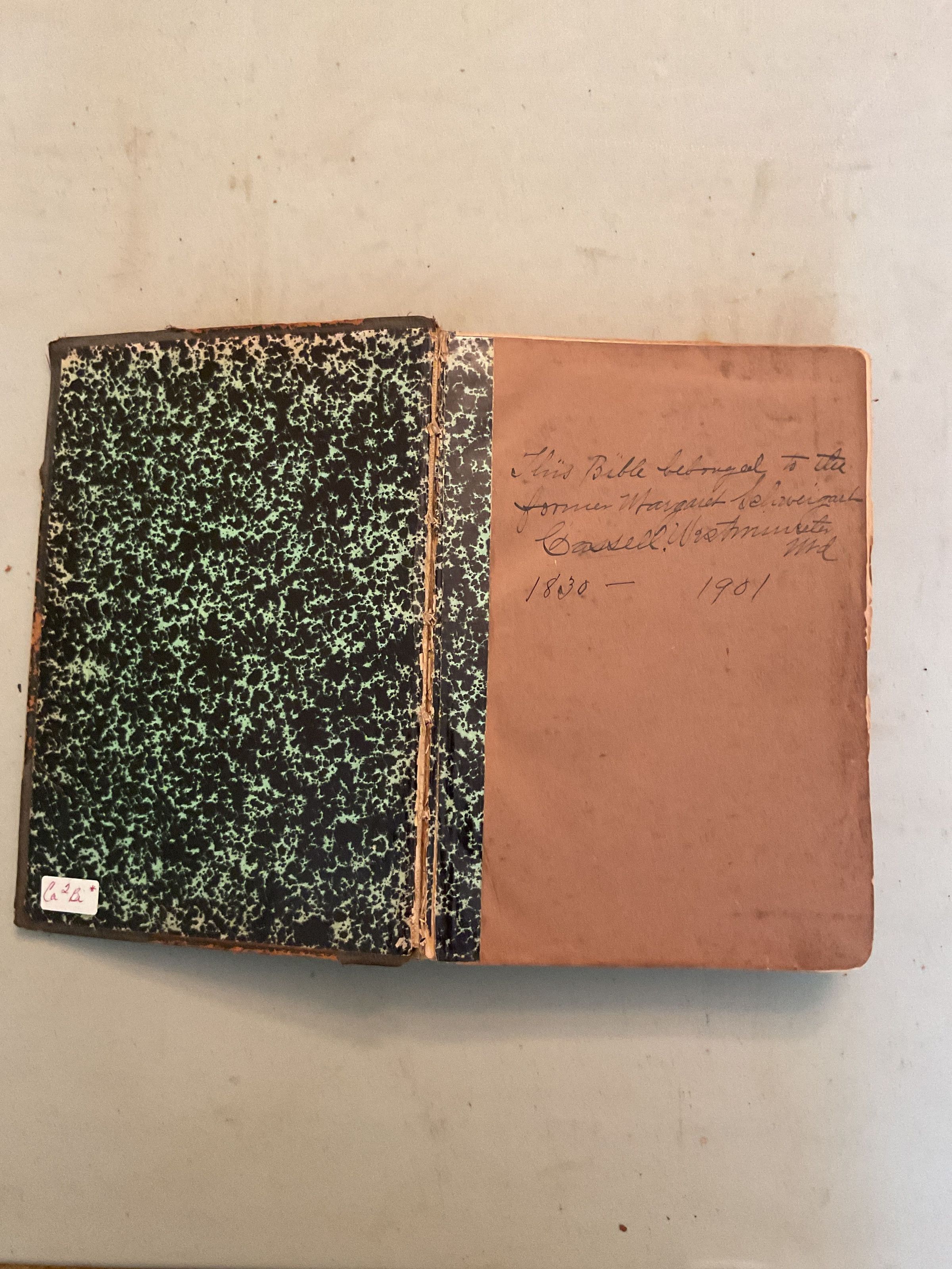 New Testament published in New York in 1861. Inscription on the inside reads “This Bible belonged to the former Margaret [indecipherable] Casswell, Westminster MD 1830-1901.”