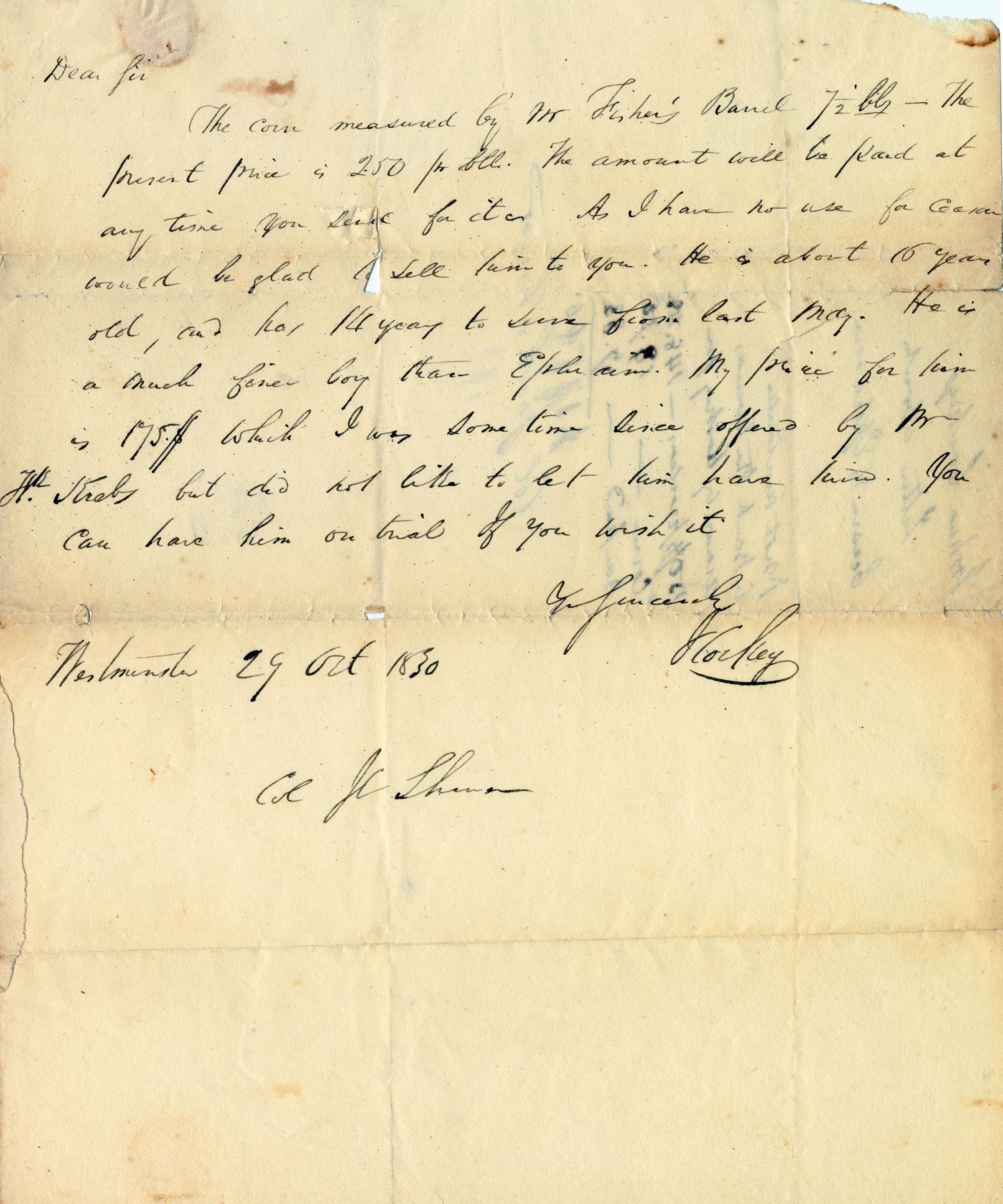 Letter. To Col. Jacob Shriver from Joshua Cockey, refers to sale of slave, Oct. 29, 1830. Handwritten, 10"x 8".
