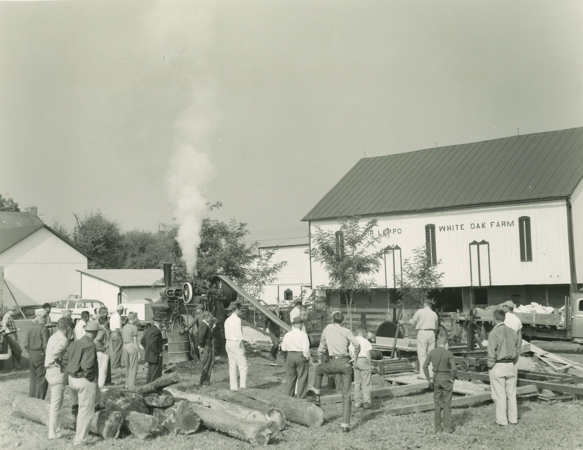 B/W photograph of a group of men and boys on a farm. An early 20th century steam engine appears to be employed in milling lumber near a large barn and other outbuildings. "LEPPO" and "WHITE OAK FARM" can be read on the barn.