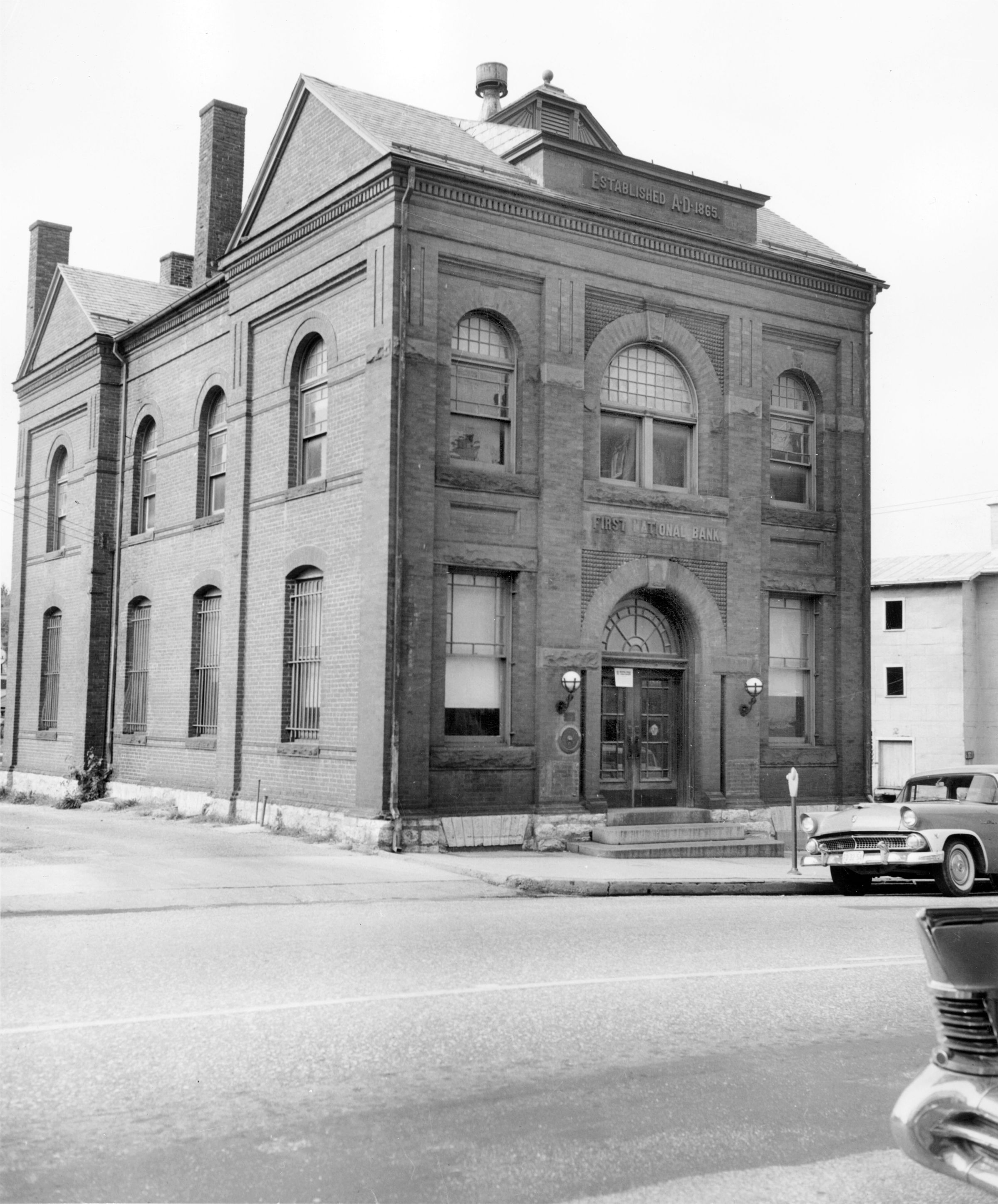 Black and white photograph (not mounted or matted) depicting the corner of the First National Bank in Westminster, MD. This photograph was taken from the road. A car a shown parked infront of the buiding near a parking meter. The very tipof the end of another car is sticking out of the photograph's proper left bottom foreground. Overall measurements: 9.9"x8.1", actual image size: 9.5"x7.6". The donor is John R. Byers.