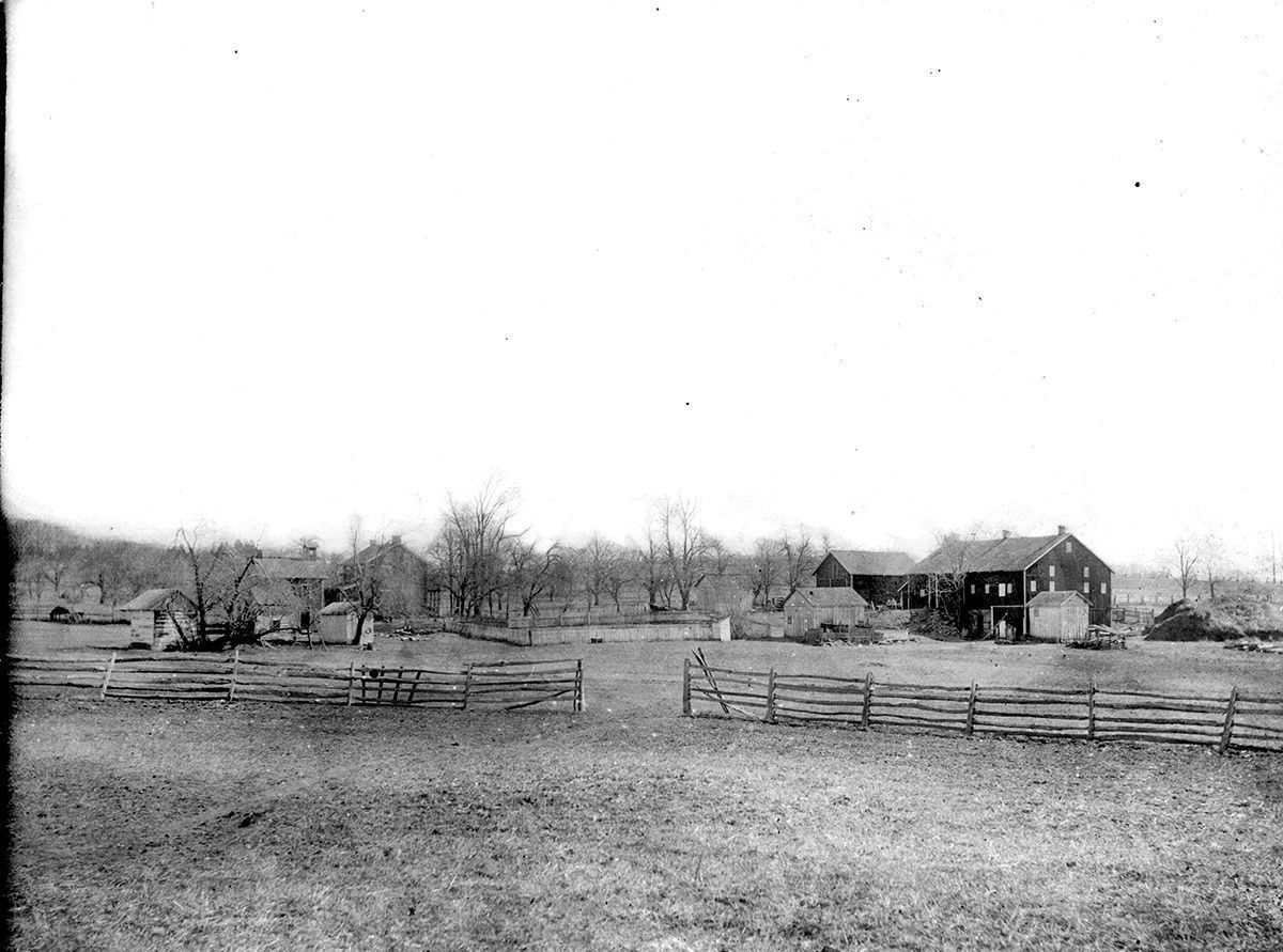 Print, photographic. B/W image of the Fleagle farm, Mayberry, Carroll County. Shows farmyard - brick house at left with 3 small outbuildings in foreground; 2 barns at right with several other outbuildings. Split rail fence runs across foreground. Written on back "Jesse Fleagle's farm near Mayberry, Carroll Co., Maryland." Image mounted on tan mat board. Overalll size: 8.125" x 10". Image measures 6" x 8". 1901Acquisition